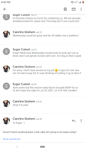 On the day of our tasting, the owner Kayla was attentive, and answered all of our questions. She put together an amazing assortment of cakes for us to taste-- and let us take home what we couldn't finish to share with our family, which we did later that night. Kayla also helped us figure out how big of a cake to order, and how many cupcakes we needed-- which really helped put me at ease, because I would have over ordered, and been left with cupcakes for days. (Not that that's a bad thing). They even had gluten free options! And pick-up and payment were incredibly easy.