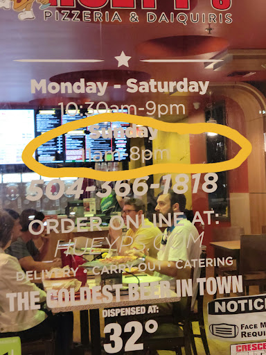 The pizza was okay, and the highlight for me was the frozen scooners of beer which reminded me of some northern pizza joints I used to go to when I lived in the DC/Maryland area. I will most likely return, since it is my daughters favorite pizza in NOLA...