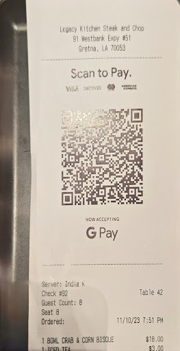 For the proprietors of Legacy, our total spend was somewhere in the neighborhood of $2,000.00. Strong work by your staff.