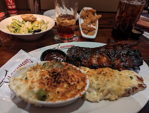 Read moreI ordered the ribeye with sauted mushrooms to be cooked medium well but I received the smallest ribeye ever that was cooked medium rare I believe. There was blood sitting on top of it & the meat was pretty much raw. I did try a bite because I usually don't complain but I could literally taste the blood.. We told the waitress who came back with another lady a few minutes later they both looked at it & asked what I wanted to do & I said that I would like a medium well steak. So they took my plate from me & said they would take care of it. Everyone else at the table was pretty much done eating at this point. So about 10 minutes later they come back with the same steak missing an entire strip of it & without my mushrooms. So i had to ask them to bring more mushrooms & they did. Although I was frustrated I tried the steak which was then like chewing on a tire so I complained again & the waitress asked if I wanted a refund on the steak. I said sure since I wasn't going to eat it. She came back a minute later & asked for my plate. She took it somewhere I'm guessing to show management & came back a few minutes later with it asking if I wanted it back. No thank you! This steak traveled around the restaurant including to be recooked. Did they seriously think I would want it back a third time. I'm giving this place 2 stars instead of one because everyone else's food was fine. My husband got a ribeye like mine cooked the same way & it came out right. If they had actually wanted to make it right they could of cooked a fresh steak or offered me something else. Instead it was half an hour of back n forth only to leave without any main course at all. It seems like a "steakhouse" would of handled this better & more professionally. We were visiting the area from out of town unfortunately this Longhorns just left a bad...