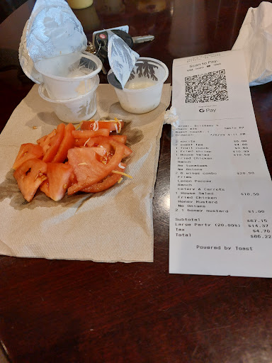 7/6/23 I and my 4 kids (16yo, 10yo, 9yo, 5yo) ate an early dinner (a little after 4pm) here as dine in guests for the first time. We normally order pickup/to go 3-4 times a month (salad and wings is the only thing we have eaten from here). It was not crowded, only 2 other tables seated at the time and what seemed like 2 servers. Adequately staffed. We waited to be seated, as there was a family placing a to go order. We were seated in the back round booth in the corner. The establishment was clean and well kempt. The music was a bit loud as our waitress repeatedly asked us to repeat what we were saying as we were ordering. We ordered fried shrimp ($10 and some change) as an appetizer. And for our main courses, 2 house salads with fried chicken ($10 and some change each) and 2, 6pc wing combos ($10 and some change each). Our appetizer came out with our salad, and the wing combos came out 10 minutes later. The shrimp appetizer was a small bowl of popcorn shrimp...so disappointing for paying over $10. The server was unable to offer us another dipping sauce for our shrimp, as the boom boom sauce the dish comes with was not on the try when she brought it out, but the were also out of tarter sauce...so we settled for ranch. Both salads had tomatoes, but we never verbally complained or sent food back. The salads and wings were good, as that is normally what we order when patronizing this establishment. I am not sure of my servers name, but she is blonde with a bull ring piercing. She was pleasant and attentive. My only issue is with the large party tax of 20%. I am a mother wit 4 kids, while I'm aware 4 kids is alarming to some, it still wouldn't b considered a large party at a national chain! When this was brought to the servers attention,she immediately offered to remove it and apologized for it!?!?! She further explained that they normally do it for parties of 5 and over. In return, I explained to her that I am a mother having dinner with my kids and not a "large party" and that it should have never been added. She removed the charge and quoted me a new total. I reluctantly paid it and went back to the table. If it can be removed at will, it leads me to think it can be added at will. If that is the case, it's sad that she felt she had to try to sneak that extra and very unnecessary charge on my check to ensure she would have a tip. I work in the food service industry and would have never done that to a mother and her kids just out to have dinner. I was displeased at the portion size for and appetizer to actually be a single small serving side of popcorn shrimp for over $10, as well as the "large party" tax. We will probably never dine in again and we will certainly limit our visits per month. Pictures is the receipt along with the tomatoes from my salad (I have a tomato allergy and break out in hives if eaten). Overall, underwhelming dine in experience experience. Currently home taking Benadryl for my hives.