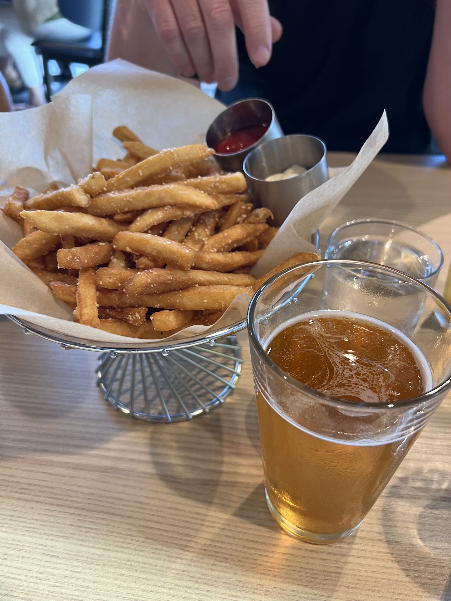 Service was not great, food took a long time and prices are higher than comparable places ($80 before tip - app, 2 beer, burger, small pizza) but food is unique and we enjoyed most. DG fries are amazing, DG pizza also great (but $20 for thick crust mini pizza ?), mushroom Swiss burger was ok - not cooked as ordered and not up to value. Lobster corn chowder - ok but very small cup. Apps and drinks were fast, but food took forever and server never checked back for refills, drink orders, or to explain delay as others after us were in and out. It was just a small pizza and burger and shouldn’t have taken over 45 minutes (after we finished our apps) with no server contact.