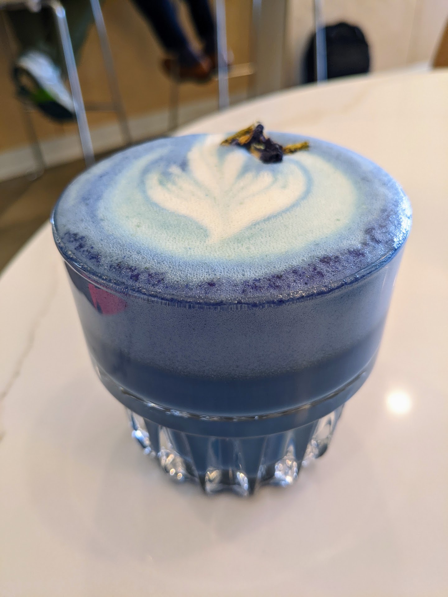 Holy wow, how is there a coffee place THIS CREATIVE and AMAZING in a strip mall in Grimes, Iowa? The drinks are inspired (seriously; I'm not overstating). The owners are friendly and obviously passionate about what they have created. On my first visit, of course I had to try the coffee flight. Boom- why don't more places offer this? On my second visit, I had a cortado with oat milk- and who knew, cortados can be good with oat milk? Then I had two drinks off of their spring menu. HOLY SCHMOLEY, I am STILL thinking about those drinks. First, the Brown Butter Oat- an Oat milk latte with house-made Browned Vegan Butter & Brown Sugar syrup, topped with a pinch of Pink Salt. That sprinkle of salt gave it a crunch and a twist that was surprising and delicious. And vegan! Then, the (mostly) caffeine-free and very colorful Blue Skies - Organic Butterfly Pea Flower (aka “Blue Matcha”), almond milk & house-made Jasmine syrup.