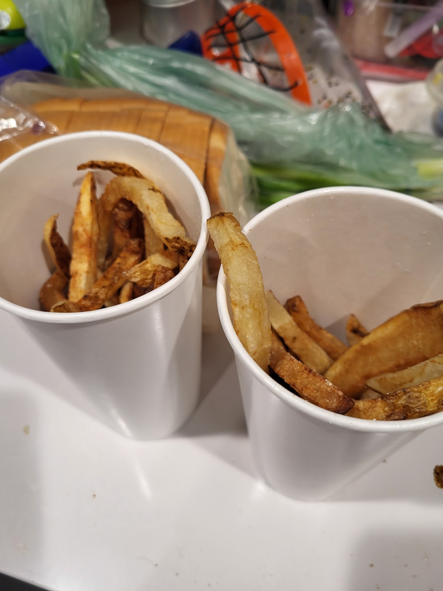 I see no appeal for their french fries at all. I don't want soggy (maybe they got fries and bacon confused that day), greasy fries with skin on! Unless they're drowned in cheese and/or gravy, peel em, put some batter on them, or onion rings or bags of chips. Garlic would probably help them be appealing as well.