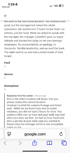 Ā Ā Ā Read moreWe had the worst dining experience thus far at this restaurant. I understand that this place is newer but you donāt open to the public unless your staff is trained and prepared or else you ruin your shot. No one informed us that there was a long wait time for food to be very clear. We were not in a hurry either so that was not the issue. Food did take well over an hour to come out though. My main concern is with the management, especially the one named Jennifer. If the owners even want this place to have a shot they need to put her through some serious customer service training or fire her immediately. The most unprofessional and rude manager I have ever met. She did nothing but make excuses and try to blame the staff for everything. No accountability and no offering solutions. No apologies. She actually argued with our entire table of adults and had a horrible attitude. I have worked in the service industry for over 10 years and I am extremely disappointed with the level of professionalism in management. This place is doomed to fail with people like Jennifer in charge. I feel bad for the staff who work under her. Place has great potential so itās a real shame. Very...