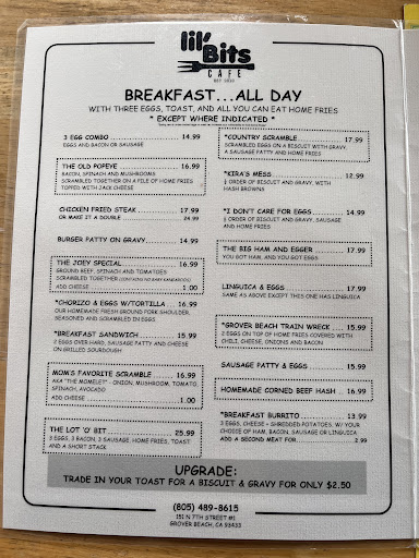 My first visit to Lil'bits Cafe. Reviews indicated it was mostly good, so, thought I would try it. On a quest to find the perfect biscuit. This ain't it. They taste OK, but they split them and grill them (shudder) before serving with jam(!). Highly offensive to this girl raised on true fluffy southern biscuits. The gravy is just about right. Not too salty, smooth, and not too thin or thick. My over-medium eggs were just a little underdone. Better that than too done with that yukky crispy edge I've had at other breakfast places. Eggs were not hot when served. Link sausage was OK. I will try their house-made sausage patty next time. Bacon was interesting. Three large slices, nicely seasoned. A bit underdone, though. Their menu offers all-you-can-eat home fried potatoes. I tried them, just so-so. Was not offered more, so I guess you have to ask. Will try hash browns next time. Pancakes were a complete miss. These large cakes looked tasty, but didn't deliver. Tough and tasteless. Would benefit from adding vanilla extract, nutmeg, sugar, and perhaps a little malt. Note to the cook: over mixing the batter makes for tough pancakes. The place was nearly empty when I arrived at 7:30am and by the time I left, the parking lot was full and the all the counter seats were taken. Many customers appeared to be regulars. Servers were very efficient and friendly. A few tables in front room lots of tables in back room. Parking lot is small and is shared with other businesses. I could be mistaken, but, the women's restroom does not appear to accommodate wheel chair access. Door is too narrow. All in all, good enough to warrant a...