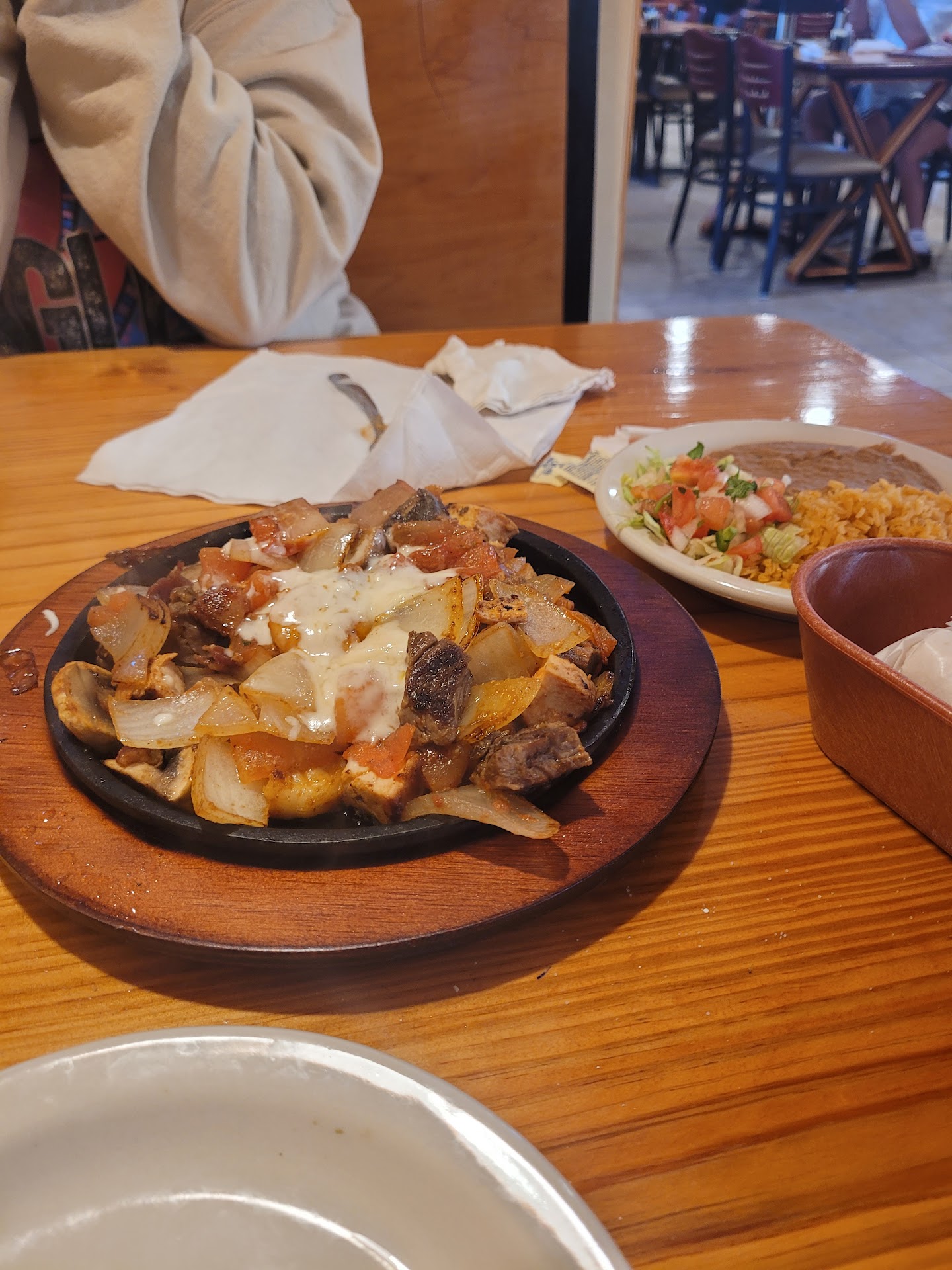 Food: The chips and salsa were good enough the salsa was thick but not chunky, not very spicy or even well seasoned. We got the carnitas fajitas for 2 which comes with carnita meat over "caramelized" onions in a cast iron with a side of beans and rice. I got carnitas because they are a litmus test for a good Mexican restaurant. Very easy to make, hard to master.
