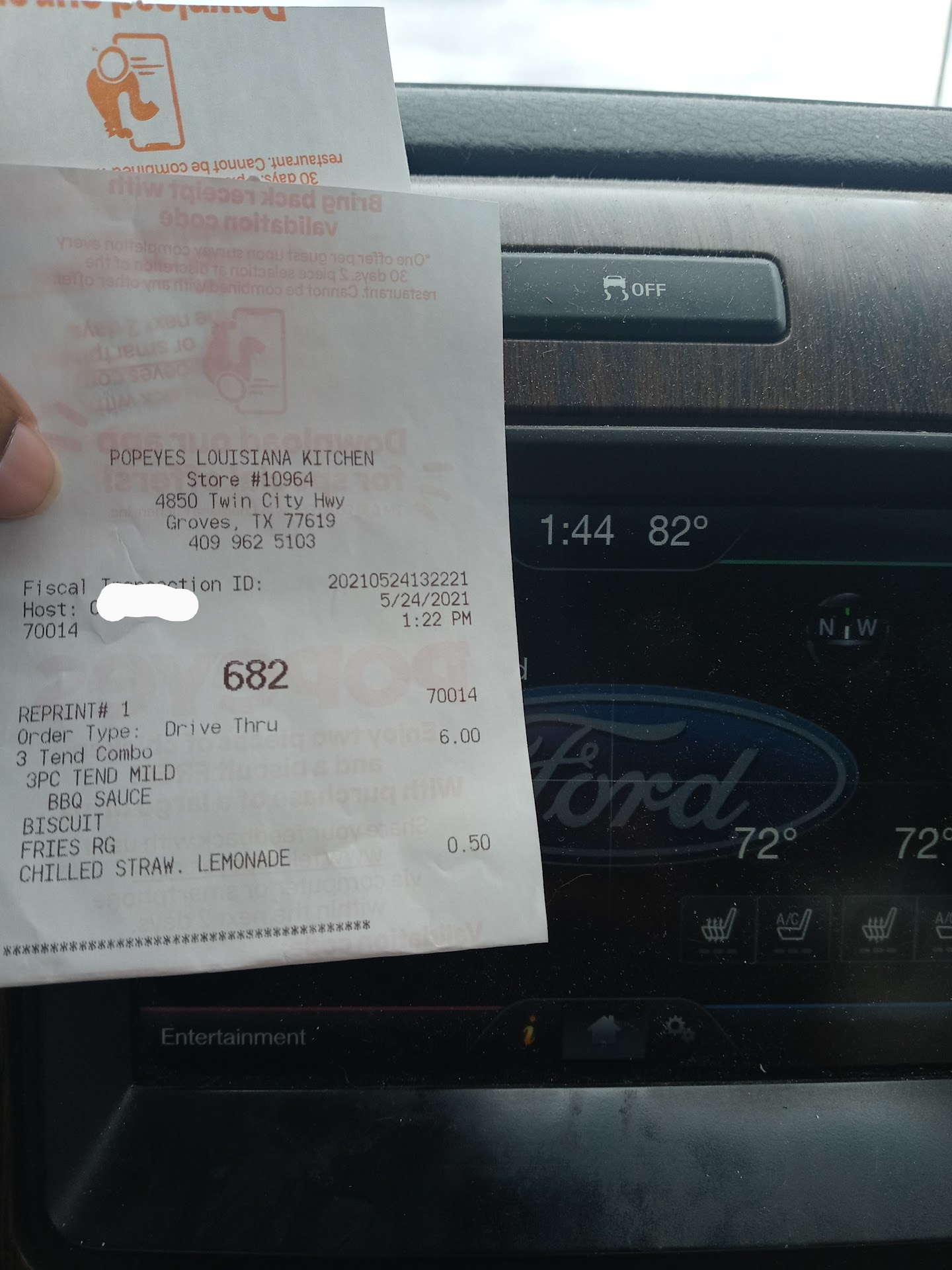 Read moreIf I could rate this location a negative five I would. This is the worst Popeyes location I have ever been at and I have been eating Popeyes chicken for the last 30 years. I made a mobile order so I would get exactly what I wanted. Spent 48 mins in drive thru only to get home and find I was shorted food. Returned to the location, waited another 29 mins in drive thru. I got attitude from the employees and when I got there, there was three employees standing outside smoking in front of the store. Paid extra for sauces we never got.... food was cold..... absolutely the worst most ridiculousness. Can't stand when people make a mistake and get an attitude when you ask them to make it right. Stay away from this...