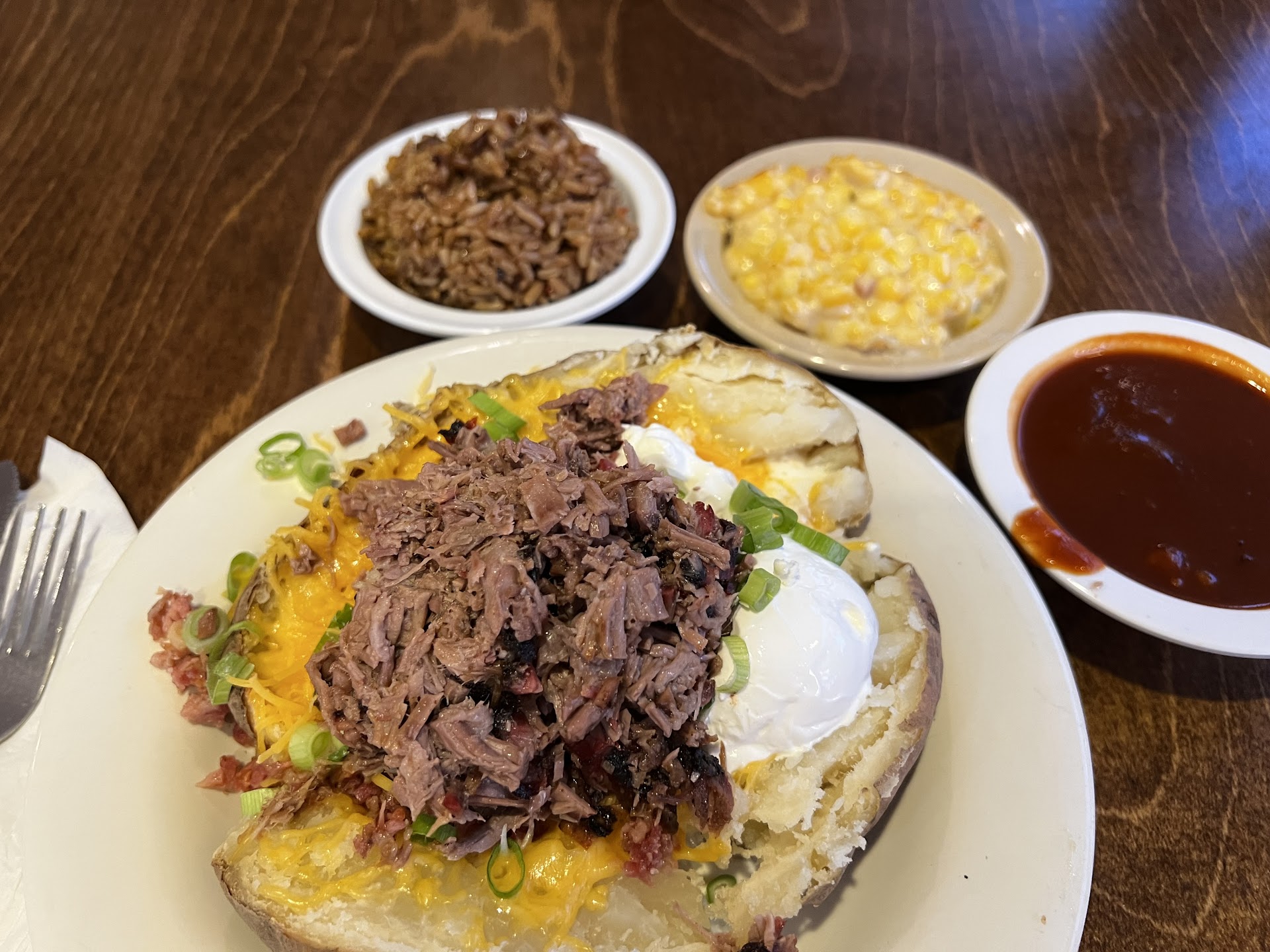 Read moreI had a chopped brisket, fully loaded baked potato. The sauce, Corn and rice on the side. The brisket was juicy, and flavorful. The bbq sauce was tangy and slight sweet. The corn was different… I’m not sure what kind of gravy it was in but it also had some ham bits? The corn had a small spice to it…. Maybe like a 2 out of 10 (in spice). The rice had like a Cajun flavor, the spice of the rice was like a 4 out of 10 ( in spice) . But everything I tasted was a 10/10 in flavor. The place was clean and all the employees were so friendly. On the down side, I thought it was a tad pricey for a mom and pop type restaurant. I spent a little over $21 on just these three items+drink.