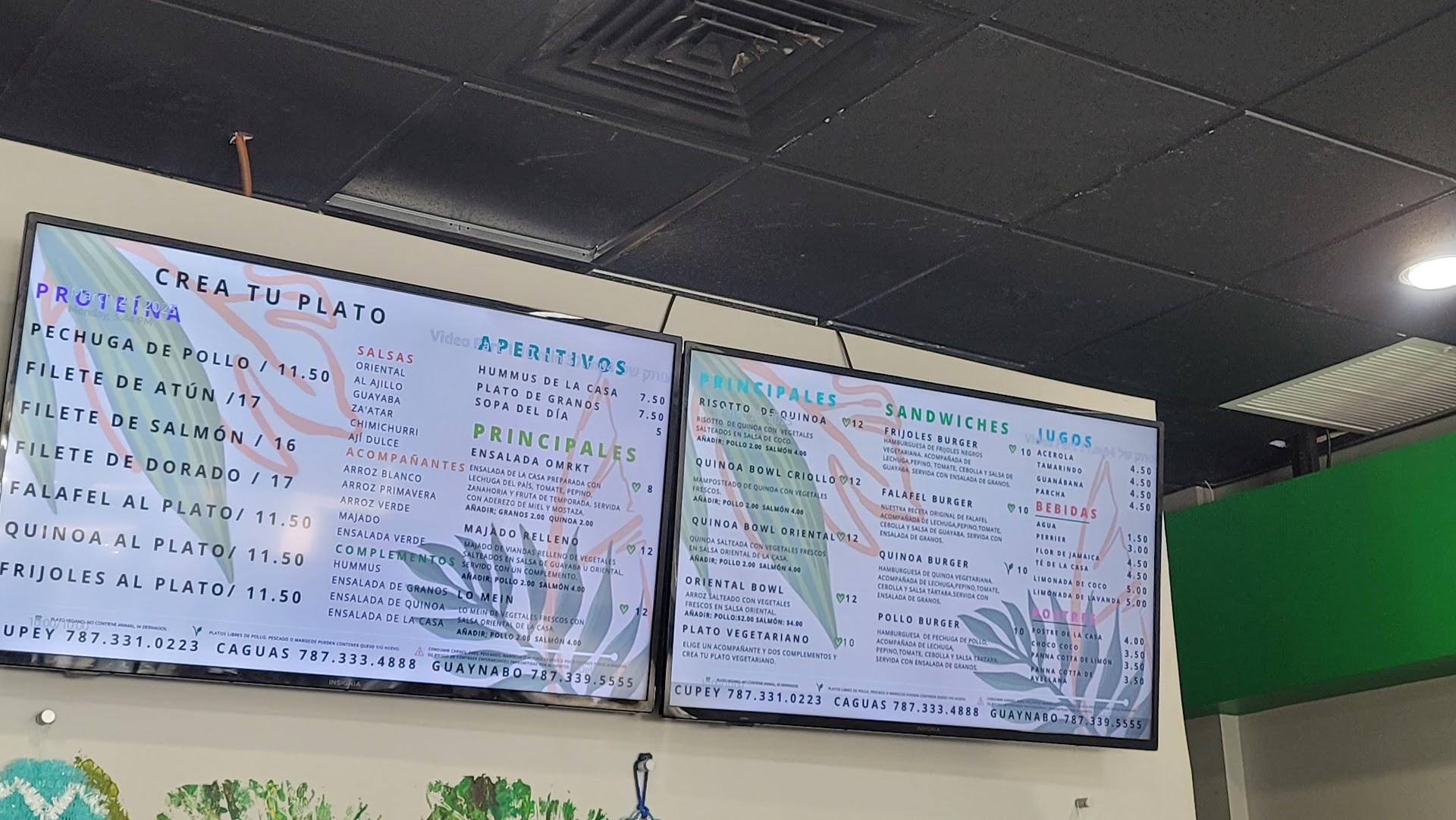 Read moreOMRKT nos sorprendió gratamente. El restaurante parece estar diseñado con la expectativa de que la comida será recogida para llevar. Hay mesas, y cada mesa tiene un juego disponible para entrenamiento de los comensales, y en algunos casos un libro. Pero la decoración es sencilla, y la comida para comer en sitio se sirve con platos y utensilios desechables ( “ecológicos”). La persona que nos atendió fue amable y amistosa, pero no diría solícita. Podíamos ver cuando la comida estuvo lista y salió de la cocina, y tuve que ir a apuntárselo a la mesera, que estaba distraída con su celular. La comida fue lo que más nos sorprendió. El modelo es tipo “bowl”; es decir , se escoge un ingrediente principal, como arroz, o quinoa, o vegetales, y se le añaden varios complementos. La mayoría de los platos son vegetarianos o veganos, y una de las opciones de complemento es añadir una proteína animal si se desea. La presentación es sencilla, sin pretensiones, en platos de cartón. Pero la comida es muy buena, y muy sanamente preparada. Nosotros comimos un “Arroz asiático” con pollo, que es más receta original que asiático, pero estaba muy sabroso, y una hamburguesa de falafel. El falafel no es el mejor que hemos probado, pero la combinación total del sándwich quedó muy bien. Las porciones son generosas, y el precio es muy razonable. Además hay una amplia variedad de jugos de fruta frescos, y postres caseros relativamente saludables (igual tienen azúcar, pero los ingredientes son frescos y naturales). Entre el nombre impronunciable y poco memorable, y la decoración poco llamativa, es fácil pasar por alto este lugar. Sin embargo, si buscas una comida original, sana, sabrosa y a precio razonable, no dejes de...