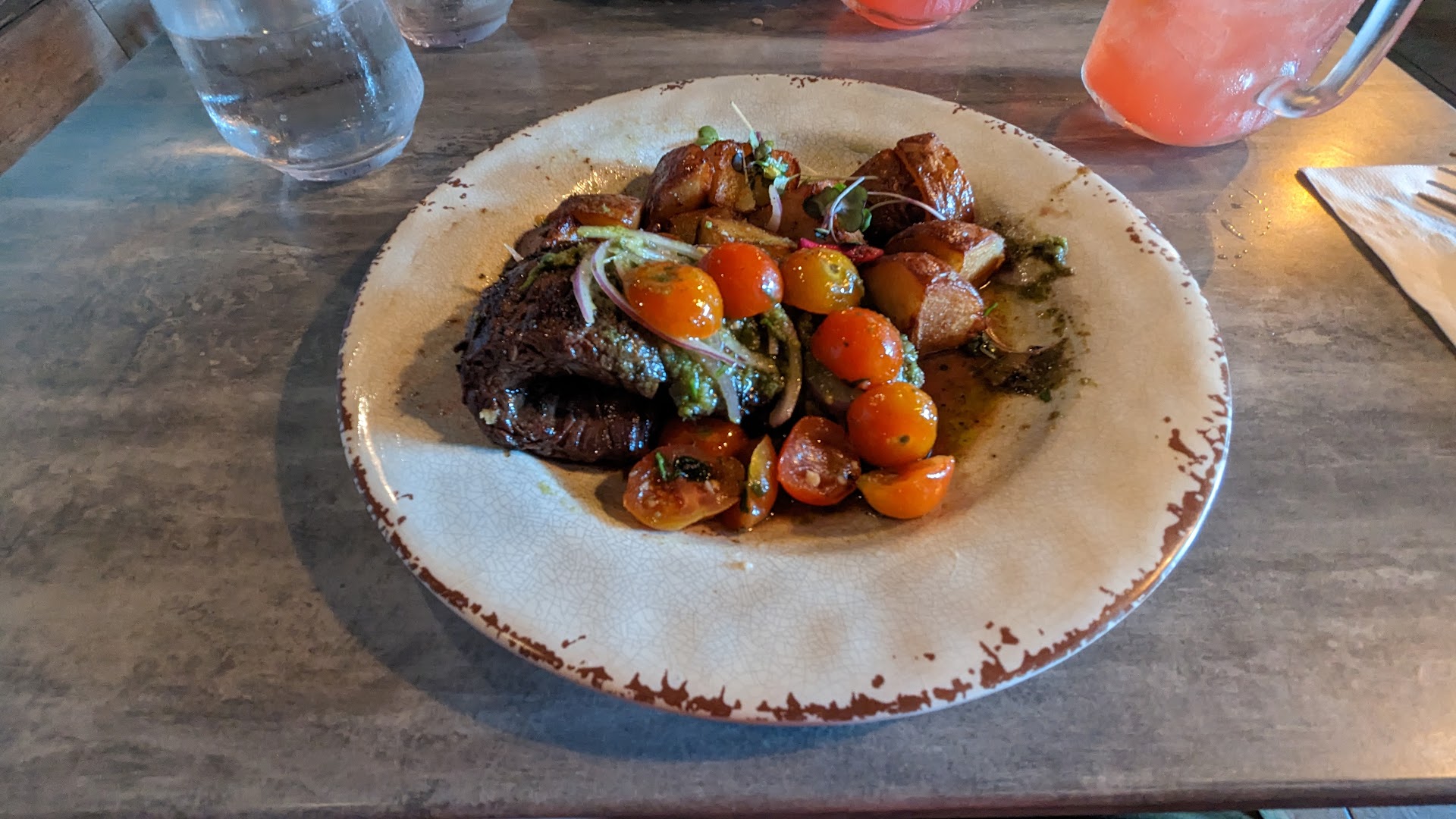 Edit: After eating here again, I notice they have an issue with consistency. I ordered the Greek Style Skirt Steak again. Rather than the thick, well-seasoned, juicy churrasco I got last time, this one was thinner than a two-day-old McDonald's beef patty. And tasted nearly as bland. The potatoes were undercooked and under-seasoned and only lukewarm. I don't really care about presentation, but that was less professional than the first visit. You can see the difference in the two attached photos. If I had been served this food last time, I would not have returned. Opa! needs to improve their consistency. First impressions are huge for a restaurant. Tonight would not have gained them repeat customers.