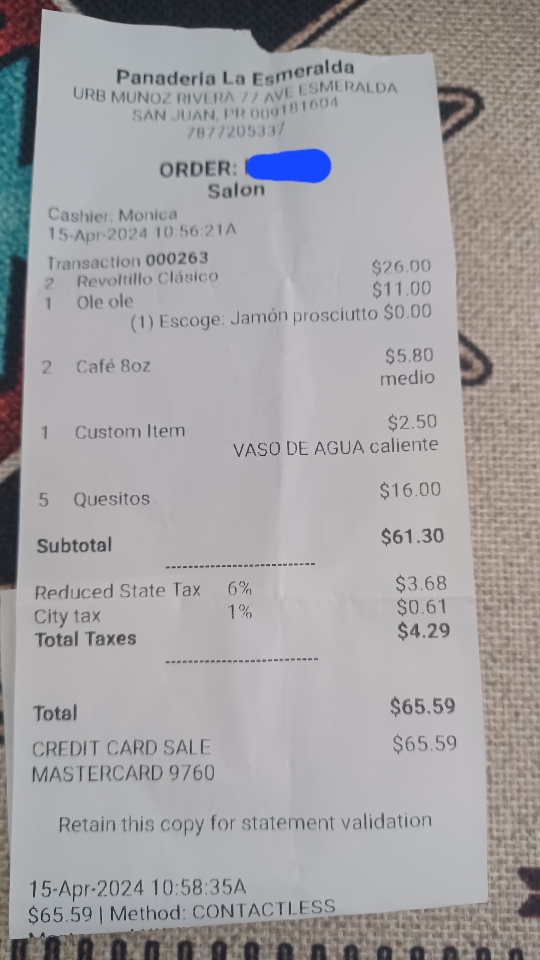 Hello everyone...La Esmeralda Bakery, Guaynabo... weekday, not too many people...😐 Let me start with the atmosphere... that's a disorganized place and you don't have an idea where to order your food 😔, tables super dirty, staff of the order- counter area completely rude and not pleasant specifically a mature lady that is always there ,the prices ridiculously high for the environment, the food taste, and services that you're looking for a supposedly high quality bakery...I went 2 times just to give them a chance, 1st time March 29, I bought 10 quesitos that I called the day before.... they had me waiting for more than 20 minutes to gave me a box of the quesitos...the disorganized environment was stressful but I waited patiently because I wanted to surprise my daughter in law in Texas with the quesitos... I regretted the $7 tip that I gave them 😕 , holy God!!! , 2nd time, yesterday... my son came from NJ, we went for breakfast, my family and I were very disappointed ☹️ nothing special about this place....they had the courage to charge us a 8 oz foam cup of hot water and not even gave us or offered a tea bag for this expensive hot water lol.. 😆 ( see the pic)... Lesson learned!!!😆 Hopefully the owner have the chance to read the review and get...