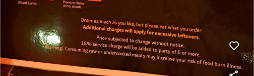 Furthermore the waitress didnât explain anything to us other than the hot pot vs grilling option. You have to get up to their condiment/side bar and get everything together yourself. We literally had to ask around us to get the info. We werenât ever asked for drink refills or explained how to work the grill (higher or lower temperatures) at all. We literally were left to figure it out.