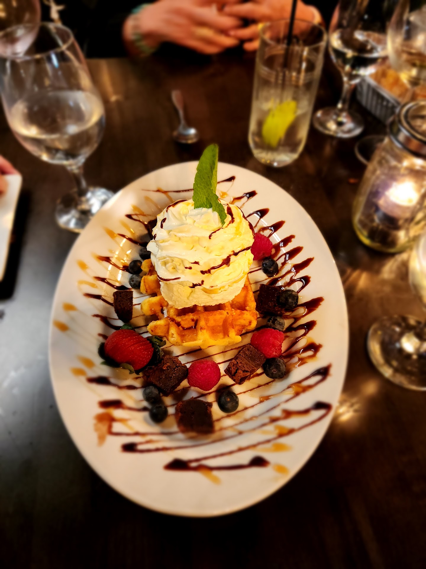 Belgian Waffle Sundae: Again, someone is overly concerned with presentation. This was delicious. Says it’s served with vanilla gelato. It’s not, it’s ice cream. Also, someone should probably investigate serving real whipped cream. The waffle tastes like awesome fried dough. Entire sundae is deconstructed, so you have to get a chunk of brownie and then try to drag everything around on the plate if you want any chocolate or caramel sauce. Meh to that presentation. Put some sauce OVER TOP of your Sundae tower.