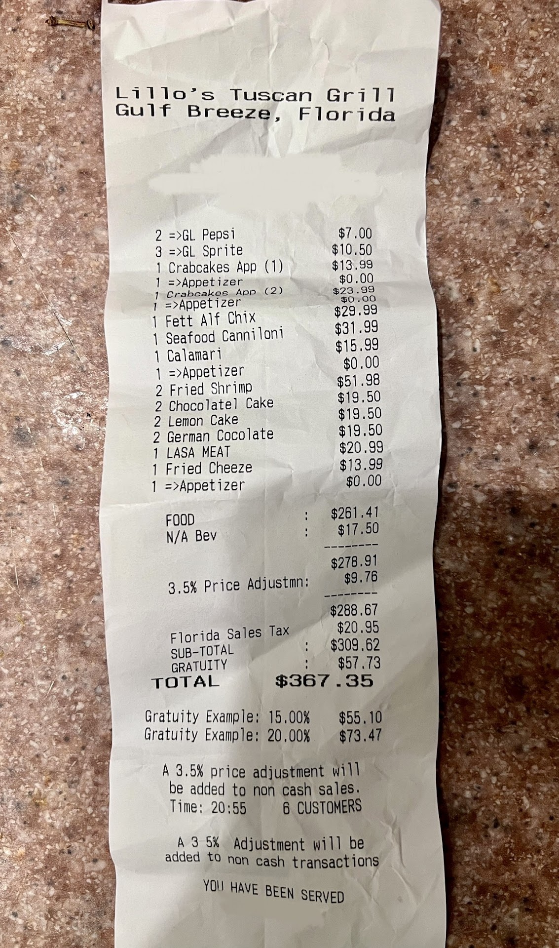 Our waitress was very nice but not attentive enough, especially considering they add their own gratuity on the ticket. She certainly didnât do $57 worth of work. For that tip she shouldâve been getting on our nerves but we barely saw her even though the restaurant was pretty much empty. We got 1 refill on our drinks and had to ask the person that brought the food out to find our waitress so we could get refills. We have both worked in the food service industry and never skimp on tips for good service but we also believe in tipping accordingly. I almost fell out of my chair when we got the $367 bill. Not in a million years was it worth almost $400 bucks to eat there. We couldâve gone to an upscale restaurant and had a mind blowing meal for that price. All in all we were extremely disappointed and would not return or recommend...