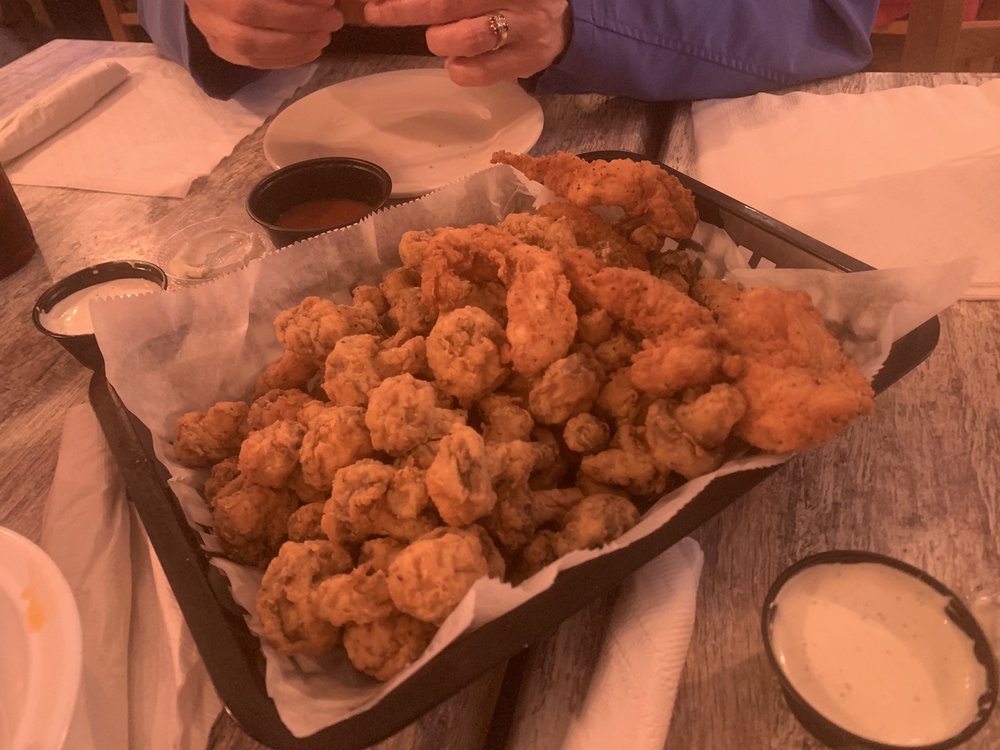 Ubered in for dinner and what a good choice! The place was packed inside and out and we were told it was an hour and twenty minute wait. Decided to stay and wait, grabbed drinks at the bar and went outside. The wait turned out to be about 40 minutes but we were talking and cutting up with the crowd so it went by pretty quickly. Everyone was in a great mood! It was st paddy's day and spring break so everything was crowded. All the young people were so friendly and brought so much energy to the evening. Anyway, we got our table and was pleased that it was on the outside seating area. The menu had so many goodies it was hard to choose. I ordered the combo platter which had crab legs, royal red shrimp, new potatoes and green beans. Yum!! I also ordered a fried crab claw appetizer. Everything was huge portions but I was sorry I had ordered so much. Not really because I ate all the shrimpies and crab and a lot of the fried crab claws. The taters were delicious as were the green beans. I do have to say I was a bit disappointed with the fried crab claws. I'd seen a photo on a different restaurant's website and they looked fat and delicious!! The ones served here were pretty skinny and not all what I had expected. But they were very tasty, just not as much meat as I expected. Our server was Chrissy and she couldn't have been better! She was running her tail off taking care of the crowds. I'm sorry to say we run her butt too, asking for more cocktail sauce, more drawn butter and more beer. She was quick as a wink every time and had a great attitude. I know there's a lot of restaurants to choose from around here but I think we made a great choice! Everything was wonderful. Everything! One thing to add... we got key lime pie (made in-house) to go and had it for breakfast today with our coffee. It too...