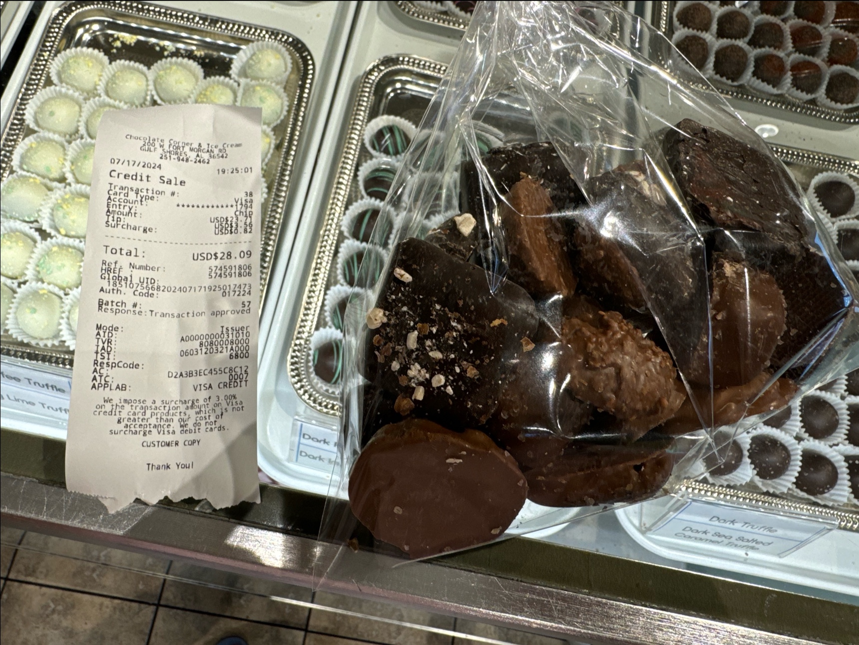 Ā Ā Ā Read moreKiller chocolates. The salted chocolate carmels are heavenly. I also bought some huge turtles and dark chocolate covered toffee. Dang Momma, itās all good. They had fudges, a large selection of different truffles, chocolate candies, dark chocolate orange peel, and a small ice cream section if wanted an ice cream cone. Staff was very friendly and I am going back tomorrow night on our last beach day before we go back home on Saturday as we are on vacation. Did I mention how amazing and delicious their chocolates are??!!?? š¤£šš« Cost is approximately $24 a lb. Plus tip and like .82 āsurchargeā. High quality and...