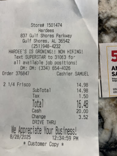 Read moreMust be a government run restaurant. Employees don’t have a clue about customer service. I admit that I was in a hurry. 6:20 am, parking lot empty, dine in empty, 3 employees behind counter. Waited in drive thru for a minute but no response, pulled around to the window. After 1 employ came to register at window and then walked off, the lady with the WIRELESS headset came over and said “did you just come thru the drive thru and then pull around without giving me time to take your order?” I said have a nice day and left. She had a WIEELESS headset. Didn’t apologize or take my order, just another smart A remark. Drove down the street to Burger King. Got a response from Drive thru immediately! Hardees in Gulf Shores, you SUCK! BTW, mentioned what happened I the local fishing guide we were with and he said that this is normal operating procedure for this particular Hardees. Must be a secret government operation because business...