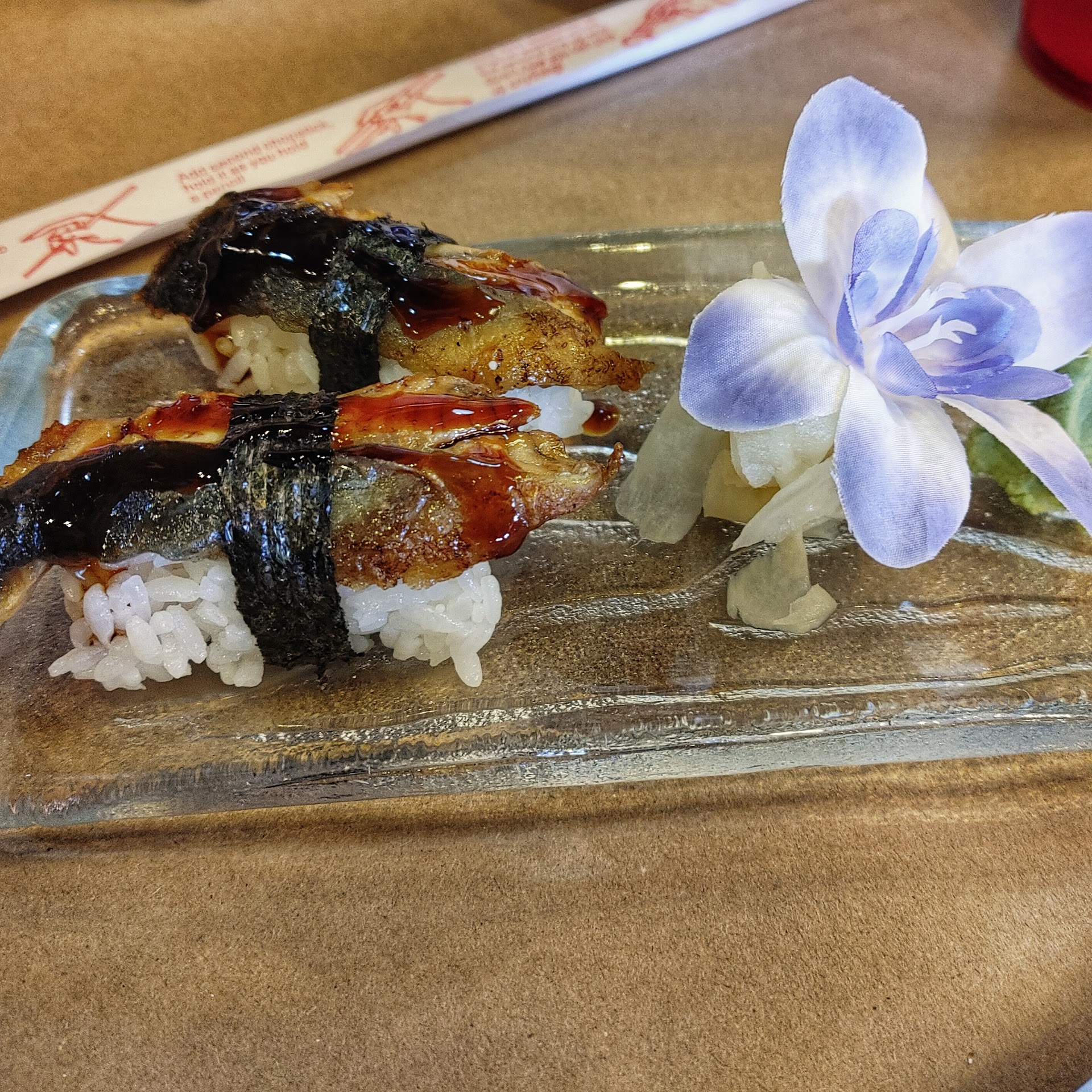 Read moreFood is good, dining-in was weak. I'd say take it to go. Napkin holders on tables are funny, you can't pull one out without the lid coming off. Half the tables have the holders with the lids already off; unpleasant to see. My advice for the owners is maybe to just stack the napkins on the table or use cloth napkins. No nice hot warm towels to wash your hands to start your meal like you'll find at many sushi restaurants and when you go to the washroom the paper towel dispenser was not working. Had to dry hands on my clothes. Portions are small for sushi, order double, seemed even less than we get at at the grocery. Salads are big. All food was good and fresh. Edamame was great. Tea was a good flavor but not enough ice so it was luke-cold and I've left was mostly melted. Small annoyances like having to ask for plates, then forks, then when the food came it was all on 1 tray as if one person was eating despite 3 of us. So we asked for plates and we divided the orders ourselves on the little coffee cup plates they gave us. Strange that they didn't give us the nice sushi presentation plates just the plates you put coffee cups on. The garlic bread was good, crisp, hot, and tasty. Music was 90's pop and it stopped half way through dinner. Not sure what was better, the silence or the 90s pop. I think the silence. Staff could have been more attentive. We had to get up and walk to them for our needs. It was quiet with only 2 tables (including ours) to serve but some staff were all talking with each other (seemed to be about work) and the server was on their phone. There's a huge projection tv, that's really awesome but it's playing a video of a 2d aquarium. My suggestion is to play music videos like I've seen on similar screens. Not sure where they get those cool videos, but the 2d screen saver-esq of a cartoon Aquarium is just a little sad. In summary, my advice is to take the food to go, it's really good, just order double sushi portions as they are on the small side. When ordering a salad, or garlic bread, order the...