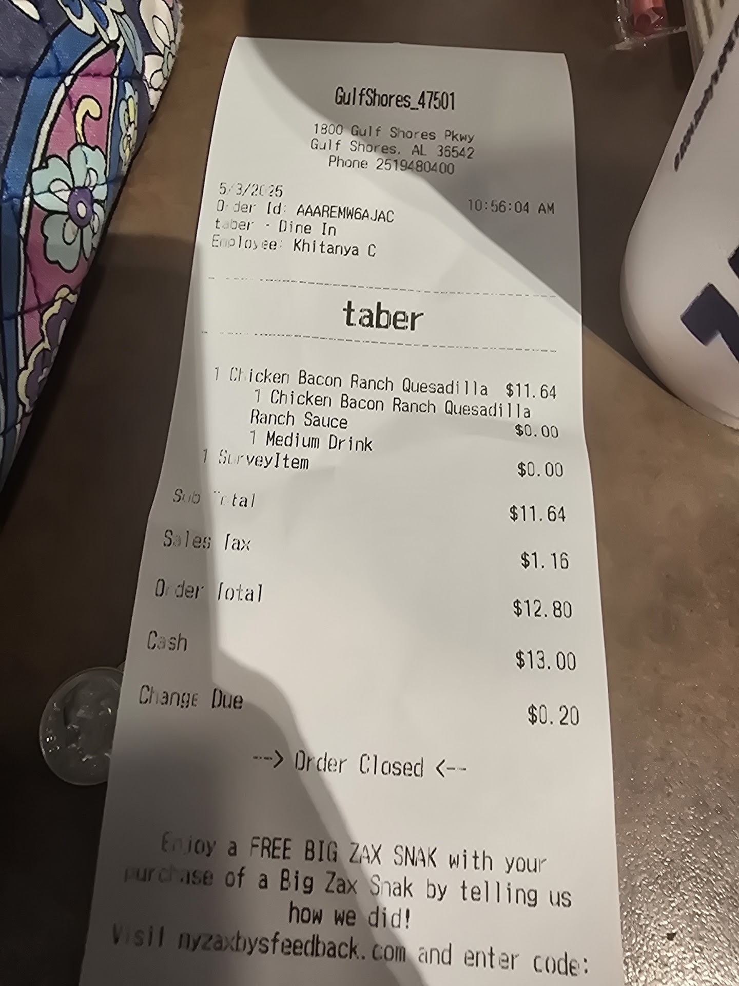 Read moreWe have been coming to Gulf Shores for the last several years and make it a point to get a few meals at Zaxby’s. We’ve always enjoyed the food, but wanted something a little different, especially some form of grilled chicken. We saw on the Zaxby’s website menu items that were not displayed on the menu board, most notably to us, the Philadelphia Chicken Cheese sandwich. When ordering, we were pleasantly surprised to see they had it and it could be grilled chicken. When our order came to us, we were pleasantly surprised at how much chicken, peppers, onions and cheese were on. We split the sandwich and have since come back several times for more. Keep it on the menu Please! Second, we have been to this location many times.The atmosphere is great with all the local sports items, but we felt the place wasn’t clean enough. The floors were either sticky or felt greasy, and the counter for drinks and condiments was not in the greatest shape. On our first few visits this year we noticed the difference, not sticky or greasy floors and the drink/condiment area was in great shape! Keep up the good work! Finally the service has been pretty constant…very good! Personable, smiling and look and sound like they enjoy...