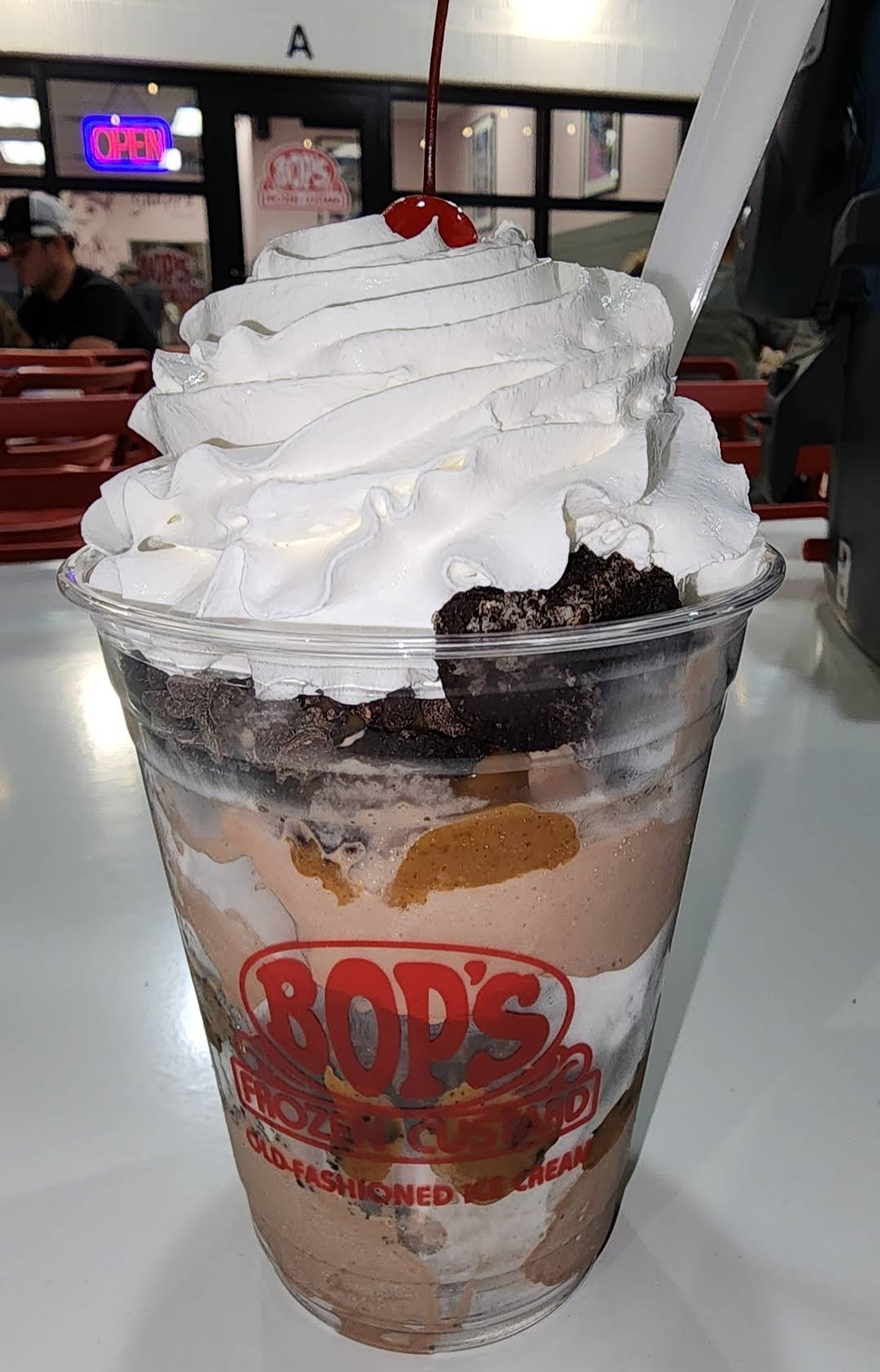 We were staying at a hotel nearby and I told my husband I wanted to stop in after dinner one night for a sweet treat. Because they are open late, we were able to take the kids for a walk from the hotel. There is a sidewalk so walking there was safe even when it got dark outside but if you drive, there is plenty of parking and a drive through. There is also indoor and outdoor seating with fans to keep the air moving in the hot summer months. The staff was super friendly and helped us with any questions we had. My son ordered the kids mini shake with Carmel sauce and he very much enjoyed it. My other son ordered a mini concrete with vanilla custard and Twix mix-ins. My husband ordered Katie’s Krunch and I ordered the Peanur Butter Mountain. We all ordered the mini sizes which was perfectly sized and just what we needed for an after dinner treat. The peanut butter sauce was AMAZING. The custard is delicious. The only thing is everything melts pretty quickly but it’s also July. We would definitely come here again to try more items off...