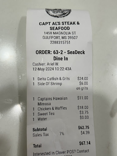 So where do I start? Captain Alâs came highly recommended. From one of the ladies at our RV resort. Where my wife and I were staying so because she raved about Captain Alâs we decided to give it a try our first time and we were greeted promptly as we walked up to Greeter counter we are promptly seated and then we were greeted by our waiter Zack Long that was very knowledgeable about the menu and made some recommendations, but because Captain Alâs came so highly recommended. So were some of their dishes so we started out with the oysters topped with the supreme seafood and Man old man hey man say man those had to be the best oysters Iâve ever eaten in my entire life. Donât consider myself a oyster connoisseur but Iâve had my fair share and those were absolutely delicious. Amazing and a experience, Iâll never forget so then at that point, my wife and I ordered I settled for the supreme seafood, Angel hair pasta my wife had the catfish with hush puppies and they both came with a side salad top with crab and most places when they say theyâre gonna top your salad with crab. Itâs just a few little shreds not much not something that you can really brag about but Iâm about to brag. The salad was absolutely amazing the crab on top was a mountain of crab. Itâs truly wasnât what I expected the ranch dressing man amazing completed the salad. It was absolutely great now letâs move on to the Angel hair supreme seafood pasta with an extra side of supreme seafood when I tell you, this is one of the most absolutely amazing dishes that Iâve had in years I do mean years this dish was super delicious. Seasoned to perfection. There was nothing I needed to do but insert my fork into that pasta and into my mouth and experience greatness. My wife and I travel the world often last Thanksgiving we had the pleasure of being in Milan Italy for Thanksgiving. We spent two weeks traveling all over Italy from Florence to Rome to Venice and Milan as well. I must say I experienced some of the best food ever created by a man and God then I come to Gulfport Mississippi, March 2025 and I must say I am very very very impressed. Captain isnât the only place weâve eaten and I must say overall I will give Captain Niles a 10 out of 10 I will be back to try it again thatâs for sure so if youâre in the Gulfport area and you want to experience some great food delicious Amazing incredible I highly suggest you get off I 10 on Cowan Road. in Gulfport, Mississippi and stop at a restaurant that I say should be World renowned everybody in the world should know about this restaurant. This restaurant is absolutely amazing. Service is amazing. The people are amazing. The owner was amazing. The servers were amazing. please donât cheat yourself like I always say treat yourself to Captain Alâs in Gulfport...