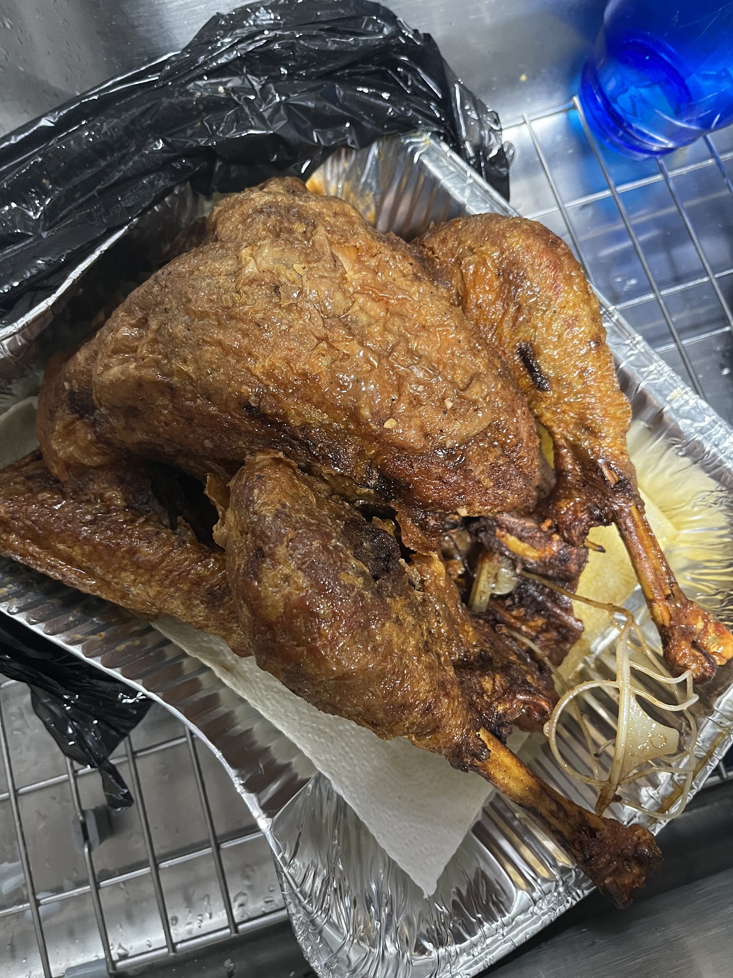 Went to pick up our preordered Cajun Fried Turkey this morning. It was so small looking that we purchased another one just to be safe. Spent $65.10 per bird. Got to my mom & dad’s house to each lunch. Birds were still warm so NEVER had to heat them. My dad went to cut one of them but stated it was overcooked and needed a chainsaw to cut. We were able to get scraps from it (NO SLICES) but it was extremely dry. My son tried to eat one of the legs but stated he couldn’t tell if he was eating bone or the skin since it had no meat. No one cared to eat the other bird so we brought it home. On our way back home that evening, I called Claw Daddy’s to inform them of how overcooked the 2 turkeys were but the gentleman just couldn’t believe it since he was the only cooking them. Wanted us to drive out of our way to exchange rather than refund some of our money. Told him we couldn’t come — so get this he has offered to give us a free one come Thanksgiving 2023. Now that’s funny!! When we got home, I tried to cut the 2nd bird with my electric knife - no can do the skin was way too hard. I got a knife and sawed through but as you can see from the pictures we got shredded DRY meat so I put in food processor and ground up for our dogs. Lesson learned DON’T ORDER FROM CLAW...