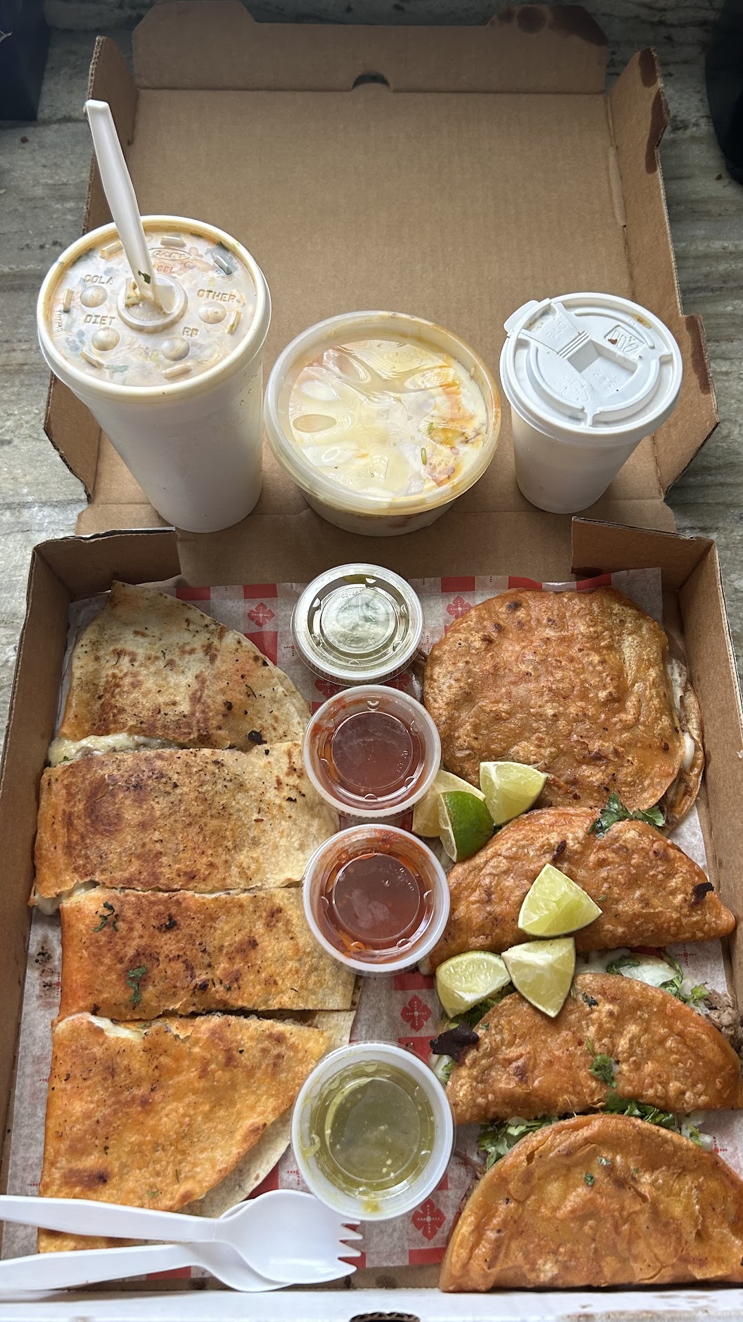 We picked up an order to go of the #4 combo featuring 1 Large Quesabirria, 3 Birria Tacos, 1 Mulita, & Birria ramen.