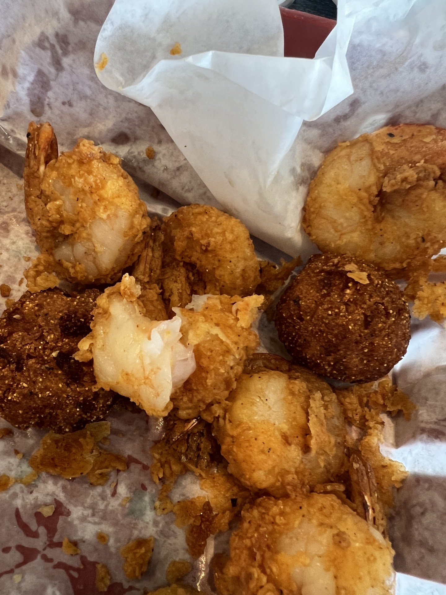 First up, the all domestic shrimp. Perfectly cooked, juicy, and seasoned just right. You could tell those little shrimp didnât travel far because they tasted fresh out of the Gulf. Marcus and John clearly know what theyâre doing. This wasnât thawed and fried shrimp, this was catch-of-the-day, say-a-little-prayer-before-you-take-the-first-bite shrimp.