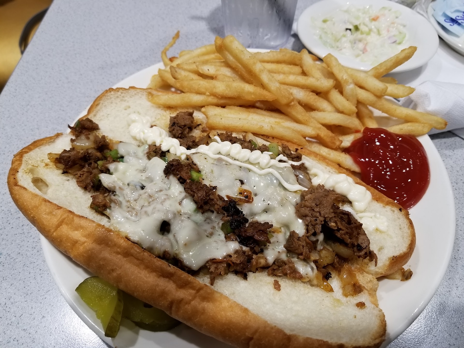 Read moreIt was a late afternoon on a Wednesday, which is normally not busy and tonight was no difference. Everything was great in the beginning. We were guided to our table with menus. The waitress took our drink orders and returned with them and took our food orders. It started going down hill after that. The food arrived and looked delicious. We started eating and found several issues with the food. My husband opened his burger and found it was recooked. When I opened my Philly e I found my chipped meat hard around the edges of the meat which was a clear sign of being reheated. There was minimum cheese, onion and bell peppers. We decided to not make a scene and ate half the food. As we started eating we found no napkins. Our waitress was elsewhere, so we tried getting the attention of another waitress with no luck. I finally walked out the door and approached a person who gave me two. Husband ate burger and I ate the meat that wasn't chard. The bun was better without the meat. I took a picture but don't know how to attach. Bottom line we paid $56.00 for food, drink, and took. We have eaten here twice and was disappointed each time. This time we felt we would write a...