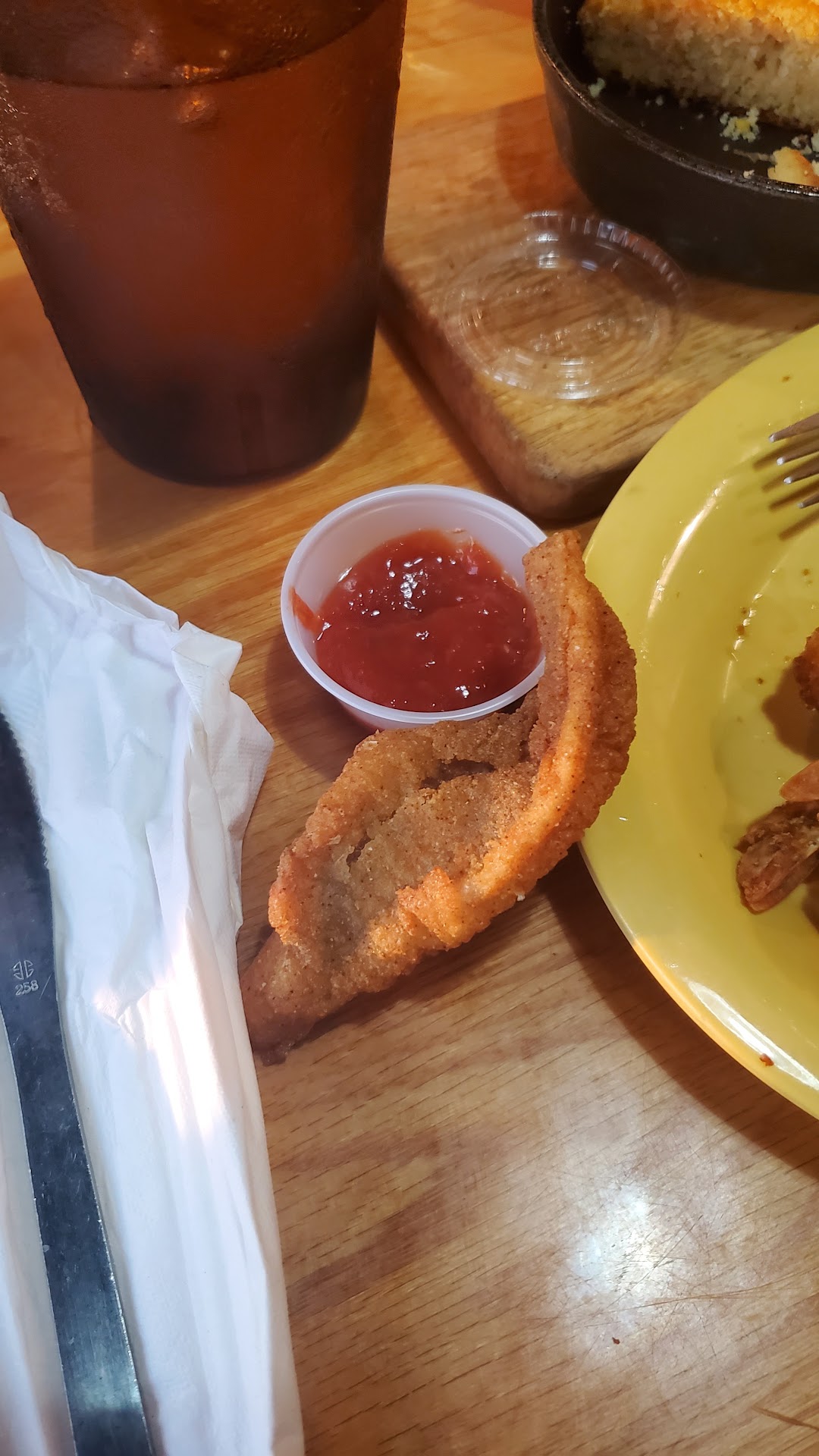 I'm not a huge fish or shellfish person, so I went with the fried tenders. All meals come with hush puppies and your choice of fries or a baked potato. As if that wasn't enough, we also ordered fried pickles to start. You are also served one pan of skillet cornbread and a cup of coleslaw per 4 people. I LOVE fried food, but even I felt a little overgreased on my way out.