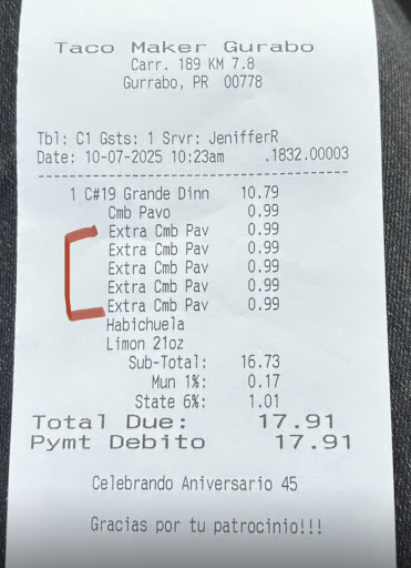 Read more2nda vez que voy y ultima en verdad que esto no se hace compre un maxi dinner y le cambie taco duro a suave me cobraron $1.00 extra algo nunca visto en otros taco makers y por encima le agregan queso y salsa al taco que cambie sin pedirle que le echaran y me cobran $1.70 extra por la salsa y el queso.las papa no tenian. sour cream ni queso y tampoco le echaron la ensalada con el sour cream.un desastre y todo por un modico precio de $11.45. Me perdonan pero le doy 6 meses pa que vuelva a cambiar de administracion.o las empleadas que tienen alli le deberian de dar mas training.nobsaben lo que estan haciendo les va a llevar el negocio...