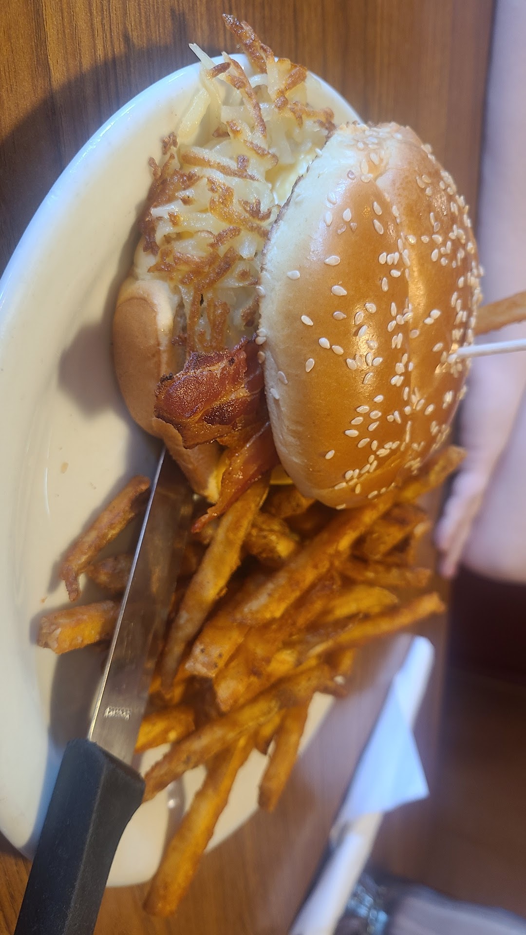 Went here to have a birthday breakfast with my sibling. The place was packed from 11am-noon while we were there. Our server was amazing and bubbly. Always made sure we were having a good time. The other people around us all were laughing and chatting having a good time creating a very positive atmosphere. I ordered a build-your-own burger which was delicious but was already falling apart before I could pick it up. Parts of the bun were already breaking away as I tried to handle it. My sibling got the premium chicken tenders figuring that would be the safest option. They normally love the tenders but the ones they received were not great. The breading was very dark and some parts didn't even have the breading on them. The taste wasn't very appealing either. On a brighter note, they did provide plenty of fries. When checking out I was called up to the counter by what seemed to be a manager. I was using some birthday gift cards to pay which accidentally stuck to the receipt from residue glue on the card. I was having a difficult time balancing everything in my hands and separating the receipt from the card so finally she helped pull the receipt from me and seemed very irritated. I proceeded to put my tip amount in and go to swipe the card which wasn't registering at first. The manager stared off into space irritated ignoring my struggle. Finally, an employee took over the transaction and the cards went through. The employee finalizing my transaction was very sweet. We then left with no other issues.