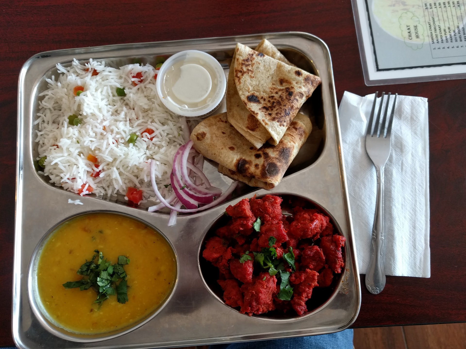 Read moreThe food was decent. I might give them another chance. Firstly the menu is ONLY for PEOPLE who KNOW the INDIAN LANGUAGE. Now I have been to about 10 different Indian restaurants in my 61 years. SOme a number of times. I have been to a couple of Indian restaurants that were PHENOMENAL. This wasn't one of them, or at least not on this day. The menu only had 3 words that a white boy from the south would understand ( or a white, black, or mexican, from ANYWHERE for that matter). They were CHICKEN,( well we ALL know that one), Goat ( yes that one too), and BUTTER. All these other words (though I do know what a TANDORI oven is, were only for someone who knows this OTHER, SECRET, language. Well when I go to a DAMN restaurant I want to have SOME idea of what is in the damn dish WITHOUT having to ask about every damn one. Unless you don't really CARE about MONEY then you would think they would have figured this out by now. HOWEVER, since I did order a bit extra to take some to work the next day it was better the next day as all the spices had muddled themselves into the chicken, rice, and other stuff. This could become a GEM someday, but it wasn't...