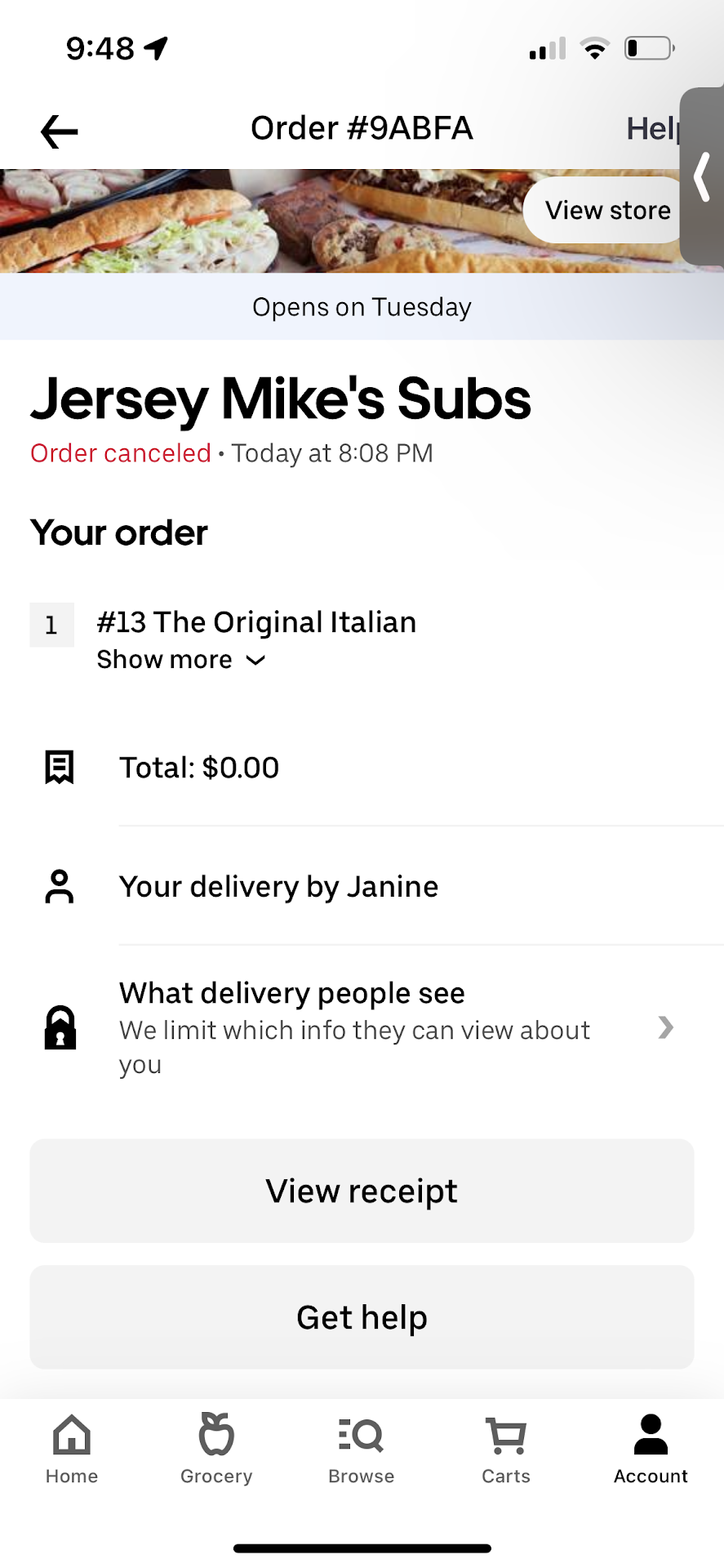 I placed an Uber eats order to this location on Monday April 22nd at 8:08PM. While waiting for the order, I receive a notification from Uber eats at 8:43PM that my order was cancelled. I called the location and spoke with one of the two workers who were working that night who told me my order was cancelled because they don’t take orders after 8:30PM. I asked if they would take my order over the phone, he paused for moment before telling me no I would have to come in. I rushed out the house and walked into the location at 8:59PM. I asked for an Italian on wheat and the shift lead who was working responded to me saying “We don’t have an online order for Laura”. I said “I didn’t even tell you my name” he said that it was the same order that got cancelled. I said I know that’s why I came in I just spoke with the other employee who told me I could come in and place my order. The shift lead just stood there and looked at me and said “so you still want the sandwich?” I said yes of course that’s why I came here, if you had taken it over the phone I would’ve just picked it up. He began making the sandwich the no lettuce no tomato only the meat and cheese, I asked him where are the toppings and he says “oh you want that too”. I didn’t give this shift lead any attitude because he was acting like he would spit in my sandwich. They both start talking and telling me that the orders get canceled through Uber eats if they are placed on or after 8:30PM I showed him my phone and the picture attached here in my review I placed the order at 8:08PM; they didn’t know how to respond. I asked the employee who spoke with me on the phone who was in charge that night and he confirmed the one making the sandwich was his boss. The shift lead refused to give me his name when I paid. When I got home I reached out to Uber eats who confirmed there was a driver assigned to the order who was notified from the store they were out of stock in items. I advised Uber eats they were fully stocked when I got there ; I attached there response as well. Today I spoke with the manager Naubella, I asked for the name of the manager who worked Monday night, she stated she’s the only manager, and that it was a shift lead; she didn’t give me his name. She stated they take orders all the way til 9PM at closing; my order shouldn’t have been cancelled. She attempted to start offering off things, I told her I didn’t make the order to get a free sandwich and I don’t want anything for free. I let her know she has a employee in charge that’s killing her business, delivering horrible customer service also training her other employees to do the same. The owner needs to reevaluate her business and the employee as a shift lead position, I wouldn’t even hire him to just take out the trash.