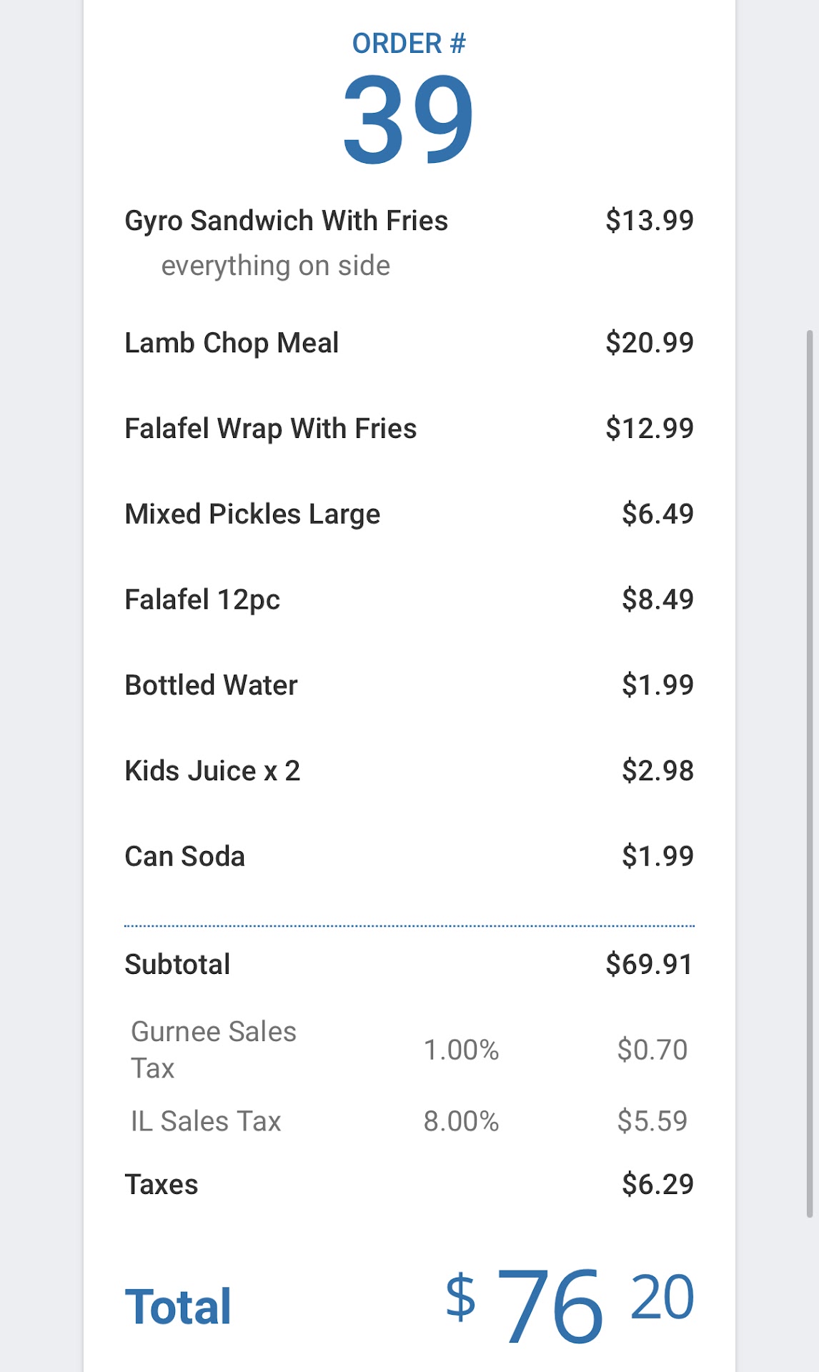 My partner and I are mostly vegetarian / pescatarian. I ordered 2 falafel wraps with a side of fries, large Jerusalem salad, baba ghanoush, hummus, (smalls which were still BIG) and a couple of really tasty beverages. Portions were large!!! couldn’t even finish my whole wrap and I have a large appetite, so does he. Everything costed about $50, which is not bad at all for this area, especially in Illinois.
