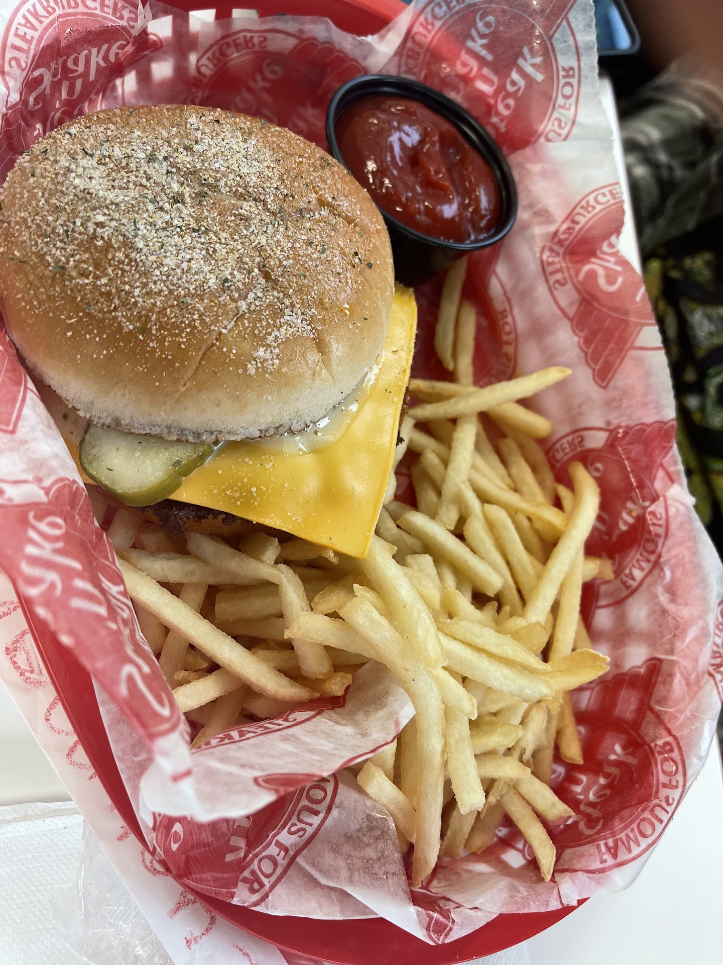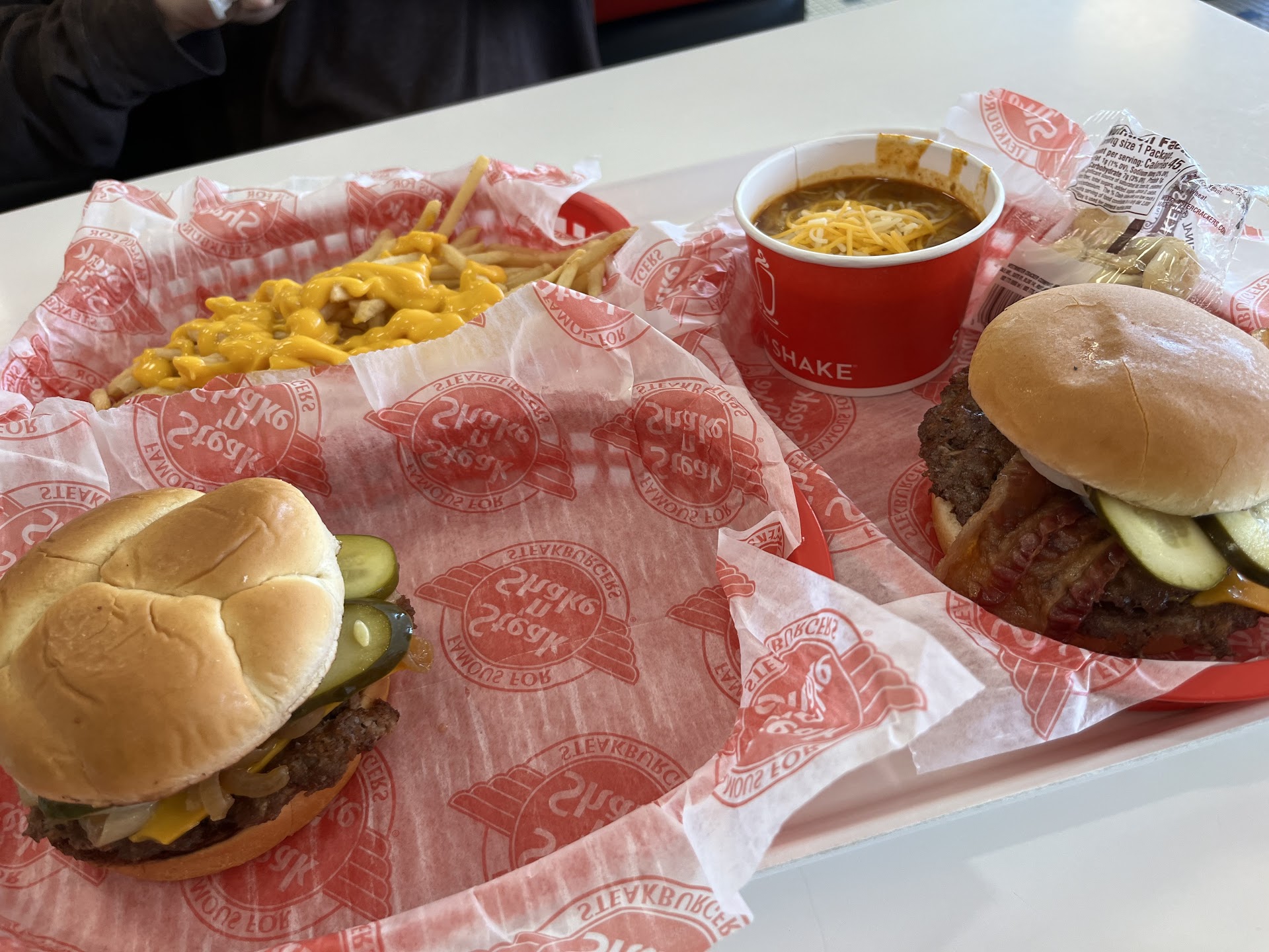 Hubby brings it to the truck. 6 burgers, 3 fries, 2 sides of extra garlic sauce. Receipt is all correct and o Inputted correctly, but missing mine to eat now with the works. He hustles back inside and says they rechecked bag, hand him a styrofoam container with works trimmings in it. I'm supposed to make it in my truck??? And wait....still only six burgers!!!!. He goes back in. Comes out AGAIN with all in hand...original bag and side "works" fixings + a garlic regular/additional side burger. Large time lapse here....now have 7th burger...his fries he wanted to eat hot on way home, now cold. And they still expect me to create my sandwich in my vehicle???