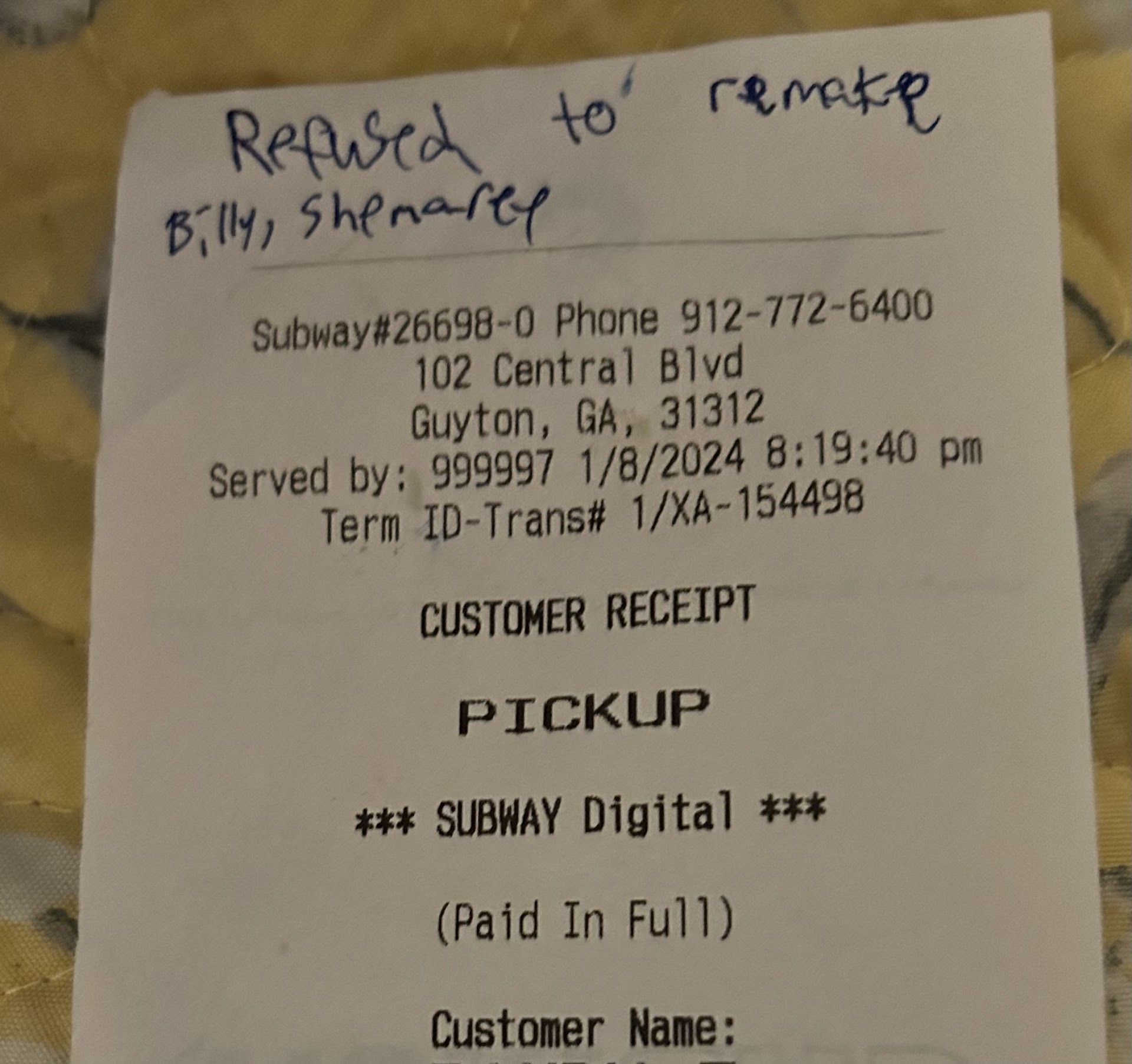 Well, I did an online order, and I mistakenly did not put in the time that I wanted to pick up. Called the store immediately. Told the young lady that answered the phone that the time was not correct, and I wanted to pick up my sandwiches up at 7:50 pm. I said I wanted to pick up at 7:50 more than once. Because on the app, you can not edit the time online. She said ok, they put on the receipt. I said 7, and they made the sandwiches at freaking 6:50, so they had been sitting there over a freaking hour. So I asked kindly before I got upset. Ok, since yall got the time wrong after I had called and said more than one, I want to pick them up at 7:50. Can you remake the sandwiches? Oh, I'm sorry we can't. Ok, well, refund my money. Oh, we can't refund the online order. That's a lie. Well, give me the mangers name. Oh, she said not to give her name, this is after they called her. Ok, well, I need the store mangers name, sorry. Ok, well.give me the district mangers name. Oh, we can't. Ok. Well, I will dispute thru my bank and get my money back. Since I did not get my food. Subway, yall just lost a...