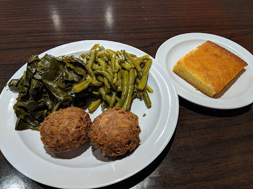 The food came out quickly and was fresh. My whiting was decently seasoned but my sides were not. My chicken wasn't seasoned enough nor was my mom's catfish. I didn't see any turkey in the greens but they weren't flavored very well. Although I prefer ACV in my greens, I will eat them without it but they have to be seasoned well and I didn't care for these. I tasted a wing and left that whole meal in the fridge, in NJ cuz my brother was sure to find it and eat it regardless. Overall, the food is bland...and that may be good for some but keep your hot sauce nearby!