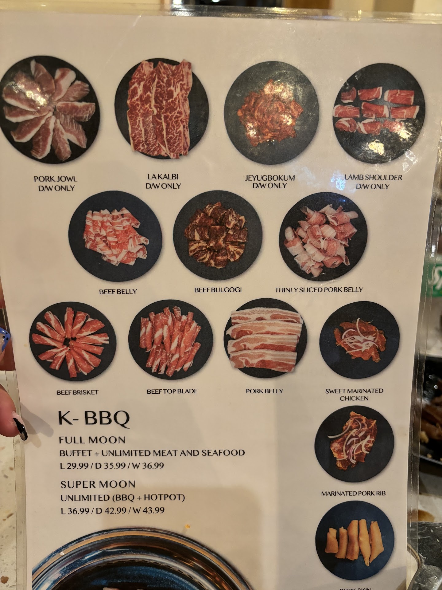 We chose the option of BBQ only. Out of the meats that we ordered, only the kalbi was marinated and tasty. The other meats didn't even have salt on it. Very bland. For K-BBQ I'm surprised they didn't even have ssamjang. The crab wasn't fresh. Didn't try the other seafood. The buffet definitely had more options for hotpot. You'd have to be real creative to find stuff to BBQ with. There's not a lot of prepared food. The japchae was bland, no salt, can't taste any sesame oil.