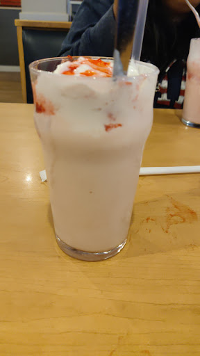 Place is not crowded - i counted one more booth taken, however service was very slow. Pictured is strawberry milkshake. It is advertised as made with real fruit....but unless someone took upon painstakingly removing all the seeds from strawberry, it is actually strawberry ice cream with strawberry flavored topping.... Kinda disappointing, i would expect truth in advertising.... When food arrived, no one on our party received any utensils....we though it was a joke - it's kinda hard eating an omelette or pancakes using straw... So after our amusement subsided, we have asked person in the kitchen for utensils... My toast was dry, and when we needed extra butter, we had to ask twice... On top of it, out check was dropped off even before we have finished our food.... I do understand that there's shortage of workers, and i wanted to support my local restaurant, but I'm having serious second thoughts about coming...