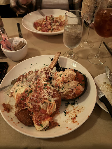The atmosphere is elegant and perfectly lit, our server Janine took amazing care of us. We started with a scallops and bacon appetizer that was served on the bacon rather than wrapped around, it was perfectly sauteed and the bacon was thick and flavorful. When we ordered, we discussed to ourselves (I thought) that we would split a Caesar Salad. It was served to us on two plates, already split by the kitchen. A small thing, but a nice touch. For our mains, I had the Veal Parmigiana and my girlfriend ordered the signature Crab Tomasso.