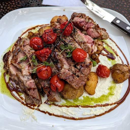 For entrees, I got the roasted peach confit duck, whilemy girlfriend got the ribeye. The roasted peach confit duck was served on top of a creamy polenta, and when eaten with a piece of the tender duck and peaches, it was quite an experience of savory, salty, and sweet flavors, with a hint of roast. The ribeye was served on top of Yukon gold potatoes, and whipped feta. The combo of the tender seasoned steak with the tangy whipped feta made me go "wow." The duck was great, but the ribeye was special.