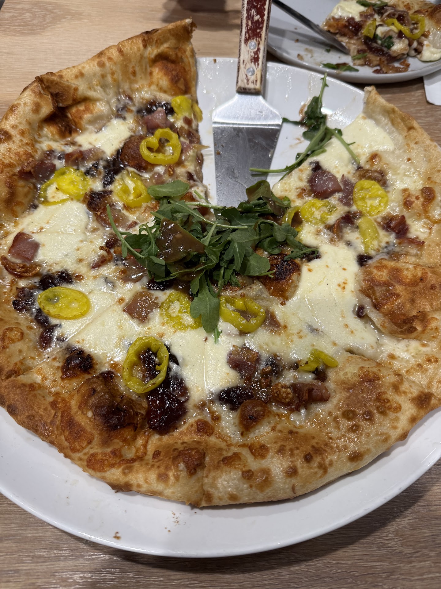 Read moreWent on a Thursday evening. Got a booth then ordered a couple of beers. Went for a large prosciutto pizza and their short rib burger with fries. Food arrived in a reasonable amount of time. The first iteration of the pizza was meatless. We asked after this and the pizza was taken away - at this time, my partner asked for a glass of water without ice (she is not an ice lover). A few minutes later our server returned with the same pizza, re (over) cooked with chunks of smoked ham on top - certainly not prosciutto. He also brought a glass of water half full of ice. During this time, I ate my burger and fries, which accounts for the stars on this review - it was decent and prepared as I had ordered. The second take on the pizza was removed after we brought the pseudo-prosciutto to the server's attention. Again she waited until the third pizza arrived, looking much the same as the second with chunks of ham (see pictures). Not what we consider a true thinly sliced ham. She ate a couple of slices and we boxed the rest and left. Three things of note here: 1. We were told that the 'chef' was new on the job. 2. This review is for the Hagerstown East (new) branch of Cafe Del Sol. We have always had excellent food and service at the other location on Salem Ave. and decided to give this place a try given it was on our way home that evening. 3. We were not charged for the pizza after what we experienced. That was worth a star. We also prefer the ambiance of the place on Salem Ave. The lighting in the new place is a bit much but the fixtures and set up are fine. Time will tell if we choose to patronize...