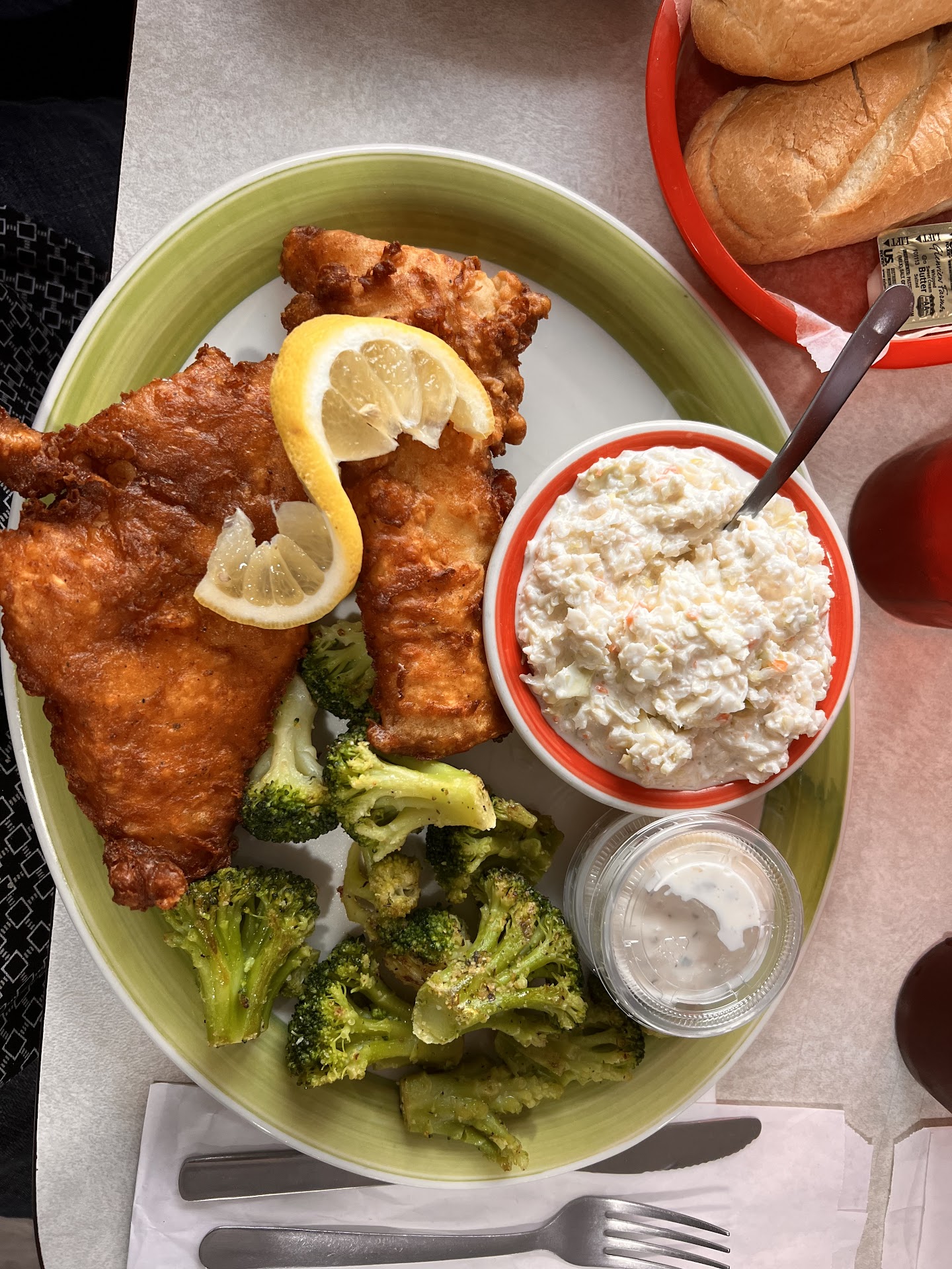 They have really good french fries like you get on the boardwalk in Ocean City and we had Haddock, shrimp scampi and Chicken Parmesan. Everyone in our party was very satisfied with the food and the service. But wait, there’s more. For dessert we had vanilla ice cream, chocolate cake with peanut butter icing and a really good cup of coffee. I can’t wait to go back.