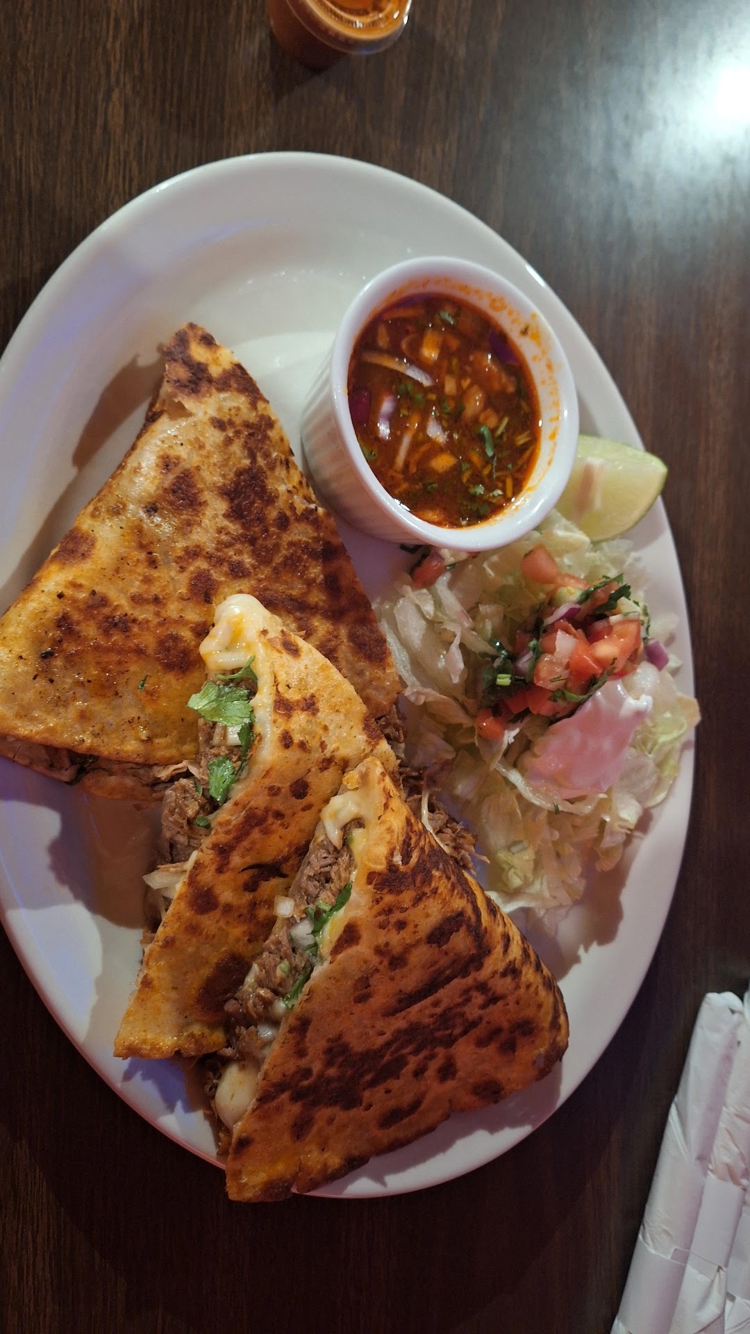 It was a great experience. The atmosphere of the establishmment is wonderful, with some spots with brighter or darker lighting, and you can choose where you'd like to be seated as long as it's not too busy. The food is fantastic, very flavorful, and very well presented. The prices are even better. If I were to compare it to other restaurants in the area, I can confidently say that you're getting more food for the same price. For example, $15 got me 3 quesabirrias and a salad, whereas other places, a similar dish would cost around $20. The only aspect of our visit that I can say could improve is service. I debated whether to put this under the review or not because this doesn't represent the establishmment or the rest of the staff, but thought I should mention anyways. Our waitress stopped at our table once on her own merit. Every other time, we had to call out to her and stop her to get her to come to our table if we needed anything. I sincerely think she was just inexperienced, and I say that because we saw how the rest of the staff performed and how they waited their tables, which is why I didn't want to include this in the review. Regardless, this didn't take away from our experience because she was VERY nice, very quick when we asked her for refills or napkins, and again, the food was amazing, they have the right idea of what they want and where they're headed, and we can see this restaurant has great potential. They just opened 3 months ago, so they're still working out what works best for them, but so far, they've been doing phenomenal! Definitely loved it, and will DEFINITELY be...