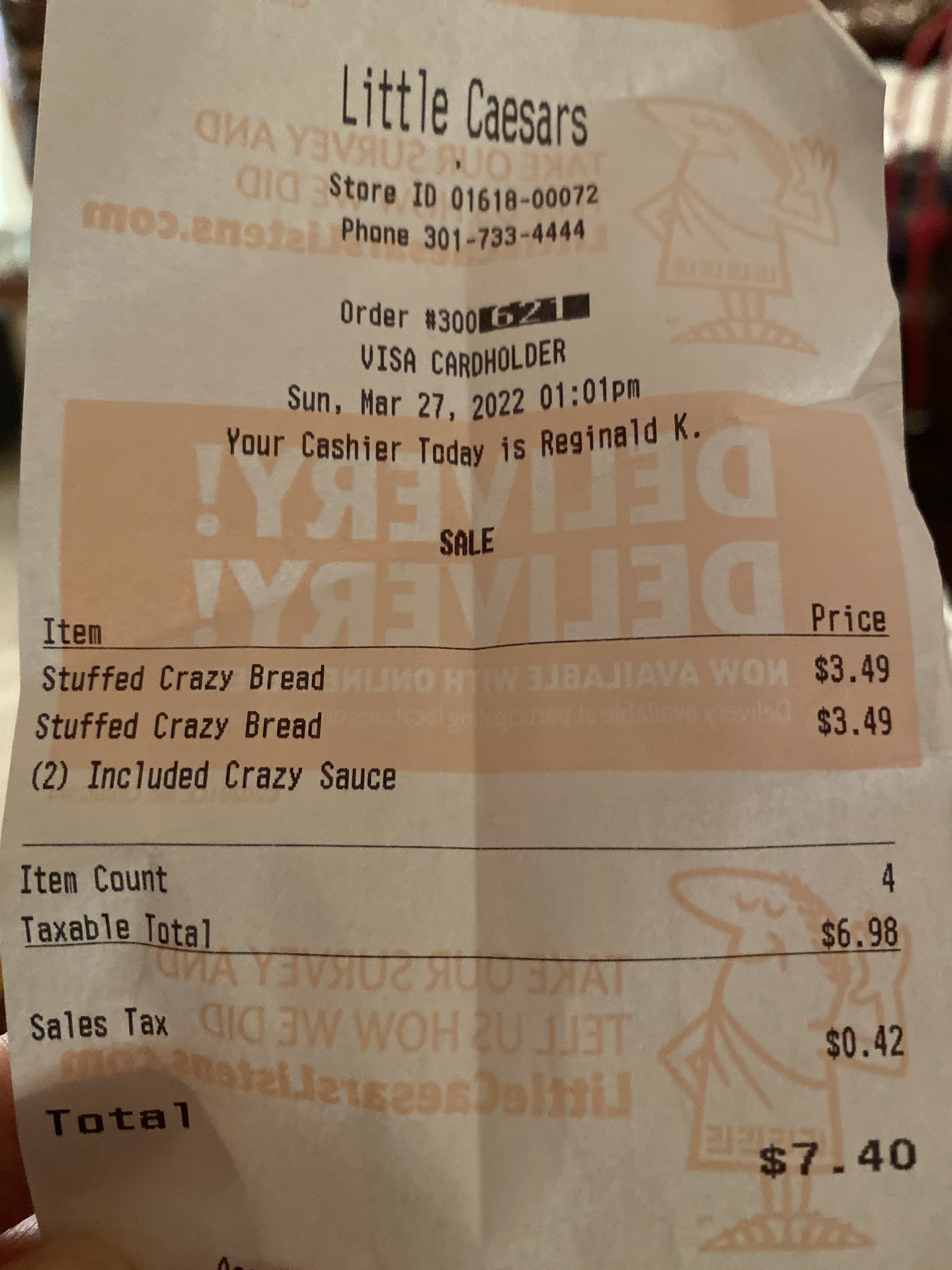 !! Bad customer service !! I waited patiently until I couldn’t. I proceeded to ask if anyone was going to ring me up for an order, all I got, was an attitude and a not at all friendly stare down by woman cashier. I was completely disregarded, and my unusually long wait time. The cashier then proceeded to take my order, “as if, I was the problem” “as if it was too hard to just ask me what I wanted to order” I know both of the cashiers/prep both had seen me as they both had been looking at me with a side eye… she then took my payment and did not say anything, about sorry for my wait nor did the other man who was running the register, as there was plenty of opportunity to do so, ever came to take my order till I acknowledged myself in both where laughing just behind the hot ready box as I was right there listening in disbelief? Why be so rude to a paying customer…? I get it it work is not favorable but it still a job why loose it for something that literally anyone can do and replace you … it’s not rocket science. I was patiently waiting for a long time with a no attitude demeanor literally just being patient till I could not stay silent. and still got horrible service. In the picture to show I only ordered 2 stuffed cheesy bread The time of order was March 27,2022 01:01 pm although the cashier name was Reginald it was a woman who rang me up. Reginald at least listen to my concerns as I was handed my order after asking possibly how long does it usually take to order this item…but it was too late to turn this experience around for me … they both need more training on customer service and how to manage a working environment just overall this place needs and could do better given...