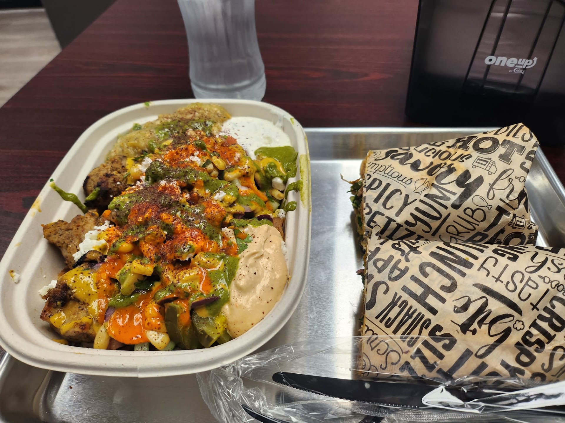 I did a Turkish bowl with half rice half lettuce, It includes lamb meat and a variety of toppings (Plus I added baba ganoush - speaking of theirs is really good!!!). She asked about my spice level preference before she put any sauces on. The food was very fresh with a lot of variety. I also got a side of falafel. The recipes and seasonings are different so I didn't just feel like I was eating the exact same thing I could have gotten elsewhere so this really does add a new great location to the community for more variety! Plus being closer to home and easier parking lot makes me very happy lol.