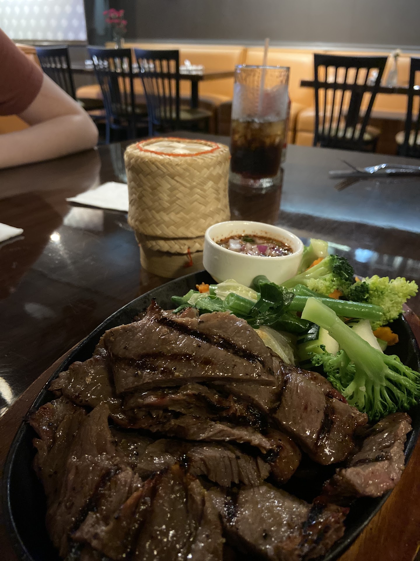 The appetizers are amazing. The fried rice, the noodles, and the meat are all amazing. The dessert is perfect, not sickeningly sweet. The Thai Iced Tea is a must-have, as are the Crab Rangoons and the Pork appetizer special when they have it. The Crying Tiger Steak is amazing. The meat is good on its own, but the sauce they provide takes it to a whole other level.