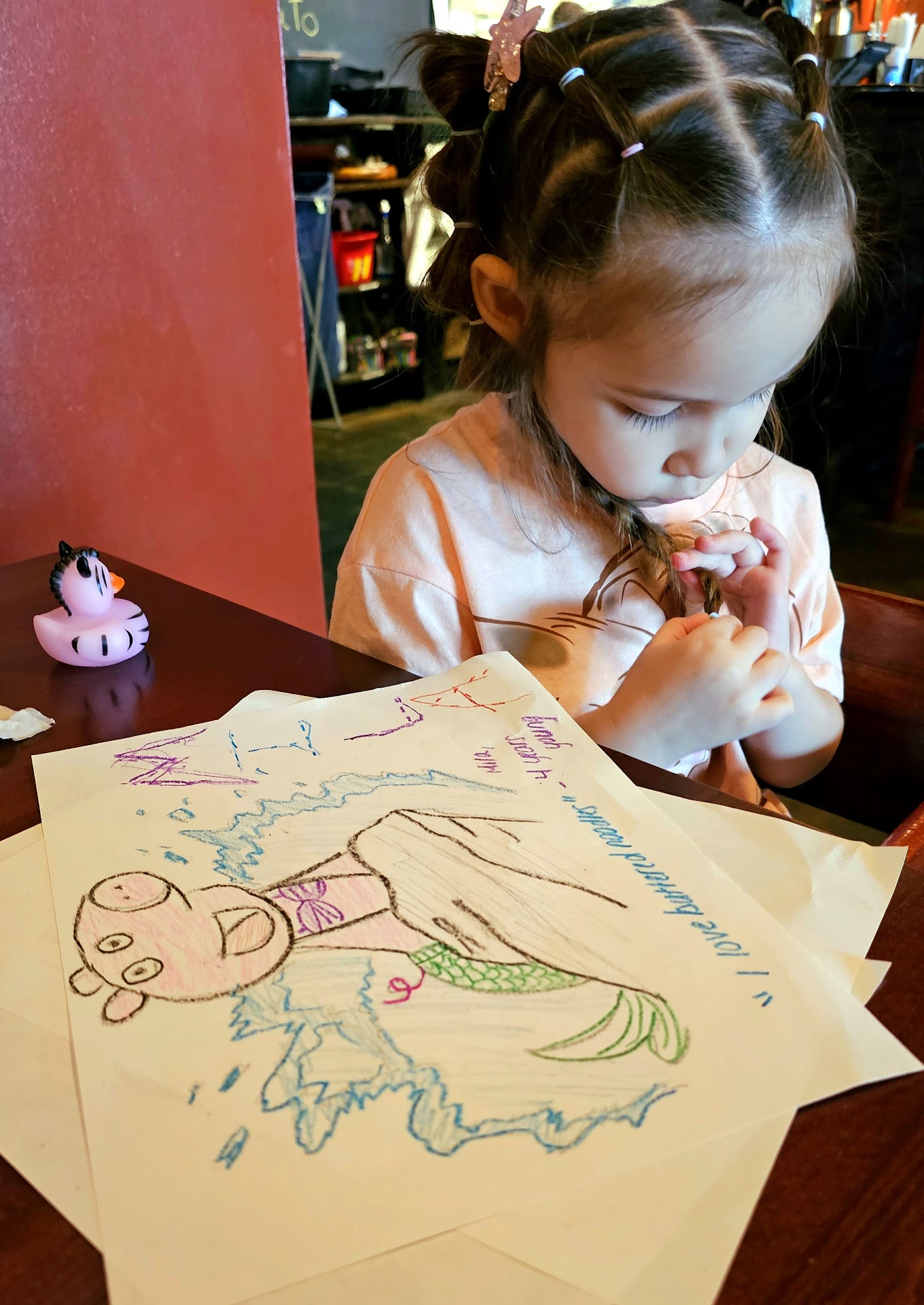 The hostess kindly approached her and gave her a pink rubber duck to have that totally changed her mood around. Upon being seated, our waitress continued to show the utmost patience for my daughter and brought her crayons and paper to draw something that they can later put on the restaurants' board.